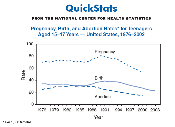 Since 1990, pregnancy rates have declined substantially for teenagers aged 15--17 years. From 1990 to 2000, the pregnancy rate decreased 33%, from 80.3 per 1,000 females to 53.5, a record low. The birth rate declined 42%, from its peak at 38.6 in 1991 to 22.4 in 2003. The induced abortion rate peaked in 1983 at 30.7 and decreased by more than half to 14.5 by 2000. SOURCES: Ventura SJ, Abma JC, Mosher WD, Henshaw S. Estimated pregnancy rates for the United States, 1990--2000: an update; and Hamilton BE, Martin JA, Sutton PD. Births: preliminary data for 2003. These reports and additional information are available at http://www.cdc.gov/nchs/births.htm.