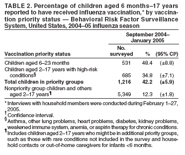 Persons using assistive technology might not be able to fully access information in this file. For assistance, please send e-mail to: mmwrq@cdc.gov. Type 508 Accommodation and the title of the report in the subject line of e-mail. Estimated Influenza Vaccination Coverage Among Adults and Children --- United States, September 1, 2004--January 31, 2005In response to the unexpected shortfall in the 2004--05 influenza vaccine supply, CDC recommended in October 2004 that vaccine be reserved for persons in certain priority groups, including persons aged >65 years and 6--23 months, persons aged 2--64 years with conditions that increased their risk for influenza complications, residents of chronic-care facilities, close contacts of infants aged <6 months, and health-care workers with direct patient contact (1). In late December 2004, based on declining demand among these groups, two additional groups (i.e., healthy persons aged 50--64 years and household contacts of all persons at high risk) were added to the list of vaccination priority groups (2). To monitor influenza vaccination coverage during the 2004--05 season, the Behavioral Risk Factor Surveillance System (BRFSS), an ongoing, state-based, telephone survey of civilian, noninstitutionalized persons, added new questions to collect information on priority status and the month and year of vaccination for adults and children (3). This report is based on analysis of data collected during February 1--27, 2005, regarding respondent-reported receipt of influenza vaccination during September 1, 2004--January 31, 2005. The results of this analysis indicated that influenza vaccination coverage levels through January 2005 among adults in priority groups nearly reached those in recent years, whereas coverage levels among adults not in priority groups were approximately half of levels in 2003, in part because 9.3% of those unvaccinated persons in nonpriority groups declined vaccination this season. The results further suggested that designation of the priority groups successfully directed the nation's influenza vaccine supply to those at highest risk. In addition, vaccination coverage among children aged 6--23 months was notable (48.4%), given that 2004--05 was the first year this group was recommended for influenza vaccination (4). In previous years, BRFSS asked adult respondents whether they had been vaccinated against influenza during the preceding 12 months. No influenza vaccination questions were asked regarding children, and the only questions related to high-risk medical conditions referred to diabetes and asthma. To more closely monitor coverage during this shortfall season, influenza vaccination questions were added during November 2004--February 2005 regarding children, priority group status, and month and year of vaccination. For comparison with the 2004--05 season, data from the 2003 National Health Interview Survey (NHIS) were used. Similar to the BRFSS survey question, NHIS routinely asks adult respondents if they received a "flu shot" during the preceding 12 months; NHIS also collects information on occupations and high-risk medical conditions. NHIS was conducted during 2003 and consisted of in-person interviews; the household response rate was 89.2%. For children, the only previous available national data on influenza vaccine coverage were collected in the 2003 National Immunization Survey (NIS), which reported on vaccination coverage during the 2002--03 season for children aged 6--23 months with an overall response rate among eligible households of 62.7% (5). Because BRFSS data collection is ongoing, final response rates for February were not yet available. Preliminary estimates indicate that the median state-level response rate for February was 51.7% (range: 33.4%--69.8%), based on CASRO guidelines. Analysis was based on 26,868 interviews from 50 states and the District of Columbia. Vaccination Coverage Among AdultsAmong adults, influenza vaccination coverage through January of the 2004--05 season was highest among persons aged >65 years (62.7%), followed by health-care workers with patient contact (35.7%) and those aged 18--64 years with high-risk conditions (25.5%) (Table 1). In comparison, the 2003 NHIS indicated coverage of 65.6% for persons aged >65 years, 40.1% for health-care workers, and 34.2% for adults aged 18--64 years with high-risk conditions. In contrast, influenza vaccination coverage among healthy persons aged 18--64 years who were not health-care workers or contacts of children aged <6 months was lower than in the previous season (8.8% compared with 17.8%) (CDC, unpublished data, 2005). Among the reasons cited by respondents for not receiving vaccination, was "saving vaccine for people who need it more," cited by 9.3% of those who were not in priority groups and were not vaccinated. This represents approximately 17.5 million doses of vaccine potentially made available to persons in priority groups. Vaccination uptake was higher in October and November and tapered off during December and January (Figure). Among the adults in the priority groups established in October, 2% of the vaccinations through January occurred in September, 40% in October, 32% in November, 17% in December, and 9% in January. Vaccination Coverage Among ChildrenInfluenza vaccination coverage (>1 doses) among children aged 6--23 months (48.4%) and among children aged 2--17 years with high-risk conditions (34.8%) was substantially higher than among children not in priority groups (12.3%) (Table 2). Of the vaccinations received through January, 17% occurred in September, 23% in October, 28% in November, 20% in December, and 12% in January (Figure). In comparison, the 2003 NIS data indicated that coverage among children aged 6--23 months for the 2002--03 influenza season, before they were recommended for vaccination by the Advisory Committee on Immunization Practices (ACIP), was 7.4% (5). Reported by: GL Euler, DrPH, CB Bridges, MD, CJ Brown, MS, PJ Lu,
