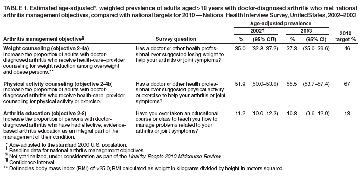 Persons using assistive technology might not be able to fully access information in this file. For assistance, please send e-mail to: mmwrq@cdc.gov. Type 508 Accommodation and the title of the report in the subject line of e-mail. Monitoring Progress in Arthritis Management --- United States and 25 States, 2003Arthritis is a chronic disease affecting an estimated 43 million (20.8%) U.S. adults and is the leading cause of disability in the United States (1,2). Arthritis results in activity and work limitations, decreased quality of life, and substantial burden to the U.S. health-care system (2--4). Promotion of arthritis self-management through weight counseling, physical activity counseling, and arthritis education can reduce pain, improve function and quality of life, and delay disability among persons with arthritis (5). To encourage arthritis self-management, three objectives were added to the national health objectives for 2010 (6). To monitor progress toward achieving these objectives and assess that progress by selected characteristics, CDC analyzed data from the 2003 National Health Interview Survey (NHIS) and the state-based 2003 Behavioral Risk Factor Surveillance System (BRFSS) survey. This report summarizes the results of those analyses, which indicated no statistically significant progress toward reaching the targets for weight counseling, physical activity counseling, and arthritis education. To meet these targets by 2010, public health and health-care agencies should increase efforts to improve awareness of these three factors among both health-care providers and patients. Such interventions will enable persons with arthritis to better self-manage their disease. NHIS is an annual, in-person survey of persons of all ages in the United States. In 2003, approximately 31,000 adults were selected as a nationally representative sample of the U.S. civilian, noninstitutionalized adult population aged >18 years; response rate for the adult sample was 74.2% (7). Respondents were considered to have doctor-diagnosed arthritis if they answered "yes" to the question: "Have you ever been told by a doctor or other health professional that you have some form of arthritis, rheumatoid arthritis, gout, lupus, or fibromyalgia?" Those who answered "yes" were asked three questions designed to monitor progress toward meeting the national arthritis management objectives for 2010 regarding weight counseling (objective 2-4a), physical activity counseling (objective 2-4b), and arthritis education (objective 2-8) (Table 1) (6). BRFSS is a state-based, random-digit--dialed telephone survey of the U.S. civilian, noninstitutionalized population aged >18 years conducted in all 50 states, the District of Columbia, and three U.S. territories. In the arthritis management module of the 2003 BRFSS survey administered in 25 states, the same questions were asked as in the NHIS survey to identify persons with arthritis and to monitor progress toward meeting the national arthritis management objectives for 2010. Response rates among the 25 states ranged from 28.8% in Connecticut to 65.5% in Utah; median response rate was 42.7% (8). Because NHIS and BRFSS both use complex sample designs, statistical weighting was used to calculate estimates and 95% confidence intervals; both NHIS and BRFSS estimates were age-adjusted to the standard 2000 U.S. population. For both surveys, prevalence estimates for physical activity counseling and arthritis education objectives were calculated from the total number of respondents who reported doctor-diagnosed arthritis. Prevalence estimates for the weight counseling objective were calculated from the total number of respondents with doctor-diagnosed arthritis who were also overweight (i.e., their self-reported height and weight produced a body mass index [BMI]* of 25.0--29.9) or obese (i.e., BMI of >30.0). In NHIS, physically inactive was defined as no participation in any leisure-time physical activity. Persons with doctor-diagnosed arthritis were considered to have activity limitations attributable to arthritis if they responded "yes" to the question: "Are you now limited in any way in any of your usual activities because of arthritis or joint symptoms?" When compared with baseline data for the national objectives collected on NHIS in 2002, NHIS data for 2003 indicated no statistically significant progress toward meeting the targets for the three arthritis management objectives (Table 1). Age-adjusted data for 2003 indicated that 21.5% of U.S. adults had doctor-diagnosed arthritis (Table 2). Among overweight or obese persons with arthritis, weight counseling was reported by 37.3% overall; among obese persons with arthritis, 56.1% reported weight counseling. Among all adults with arthritis, 55.5% reported receiving physical activity counseling. The percentage of persons receiving physical activity counseling who were obese (64.9%) was significantly higher (p<0.05) than for persons who were overweight (52.5%). Overall, arthritis education was reported by 10.8%. Adults with activity limitations attributable to arthritis were more likely to have met all three objectives than were those without such limitations. Differences within age, sex, racial/ethnic, and education groups were minimal for all three objectives. In the 2003 BRFSS, among the 25 states that administered the arthritis management questions, the age-adjusted percentage of overweight and obese persons with arthritis who received weight counseling ranged from 23.4% to 35.9%, with no state reaching the 2010 target (Table 3). Among all persons with arthritis, the percentage receiving physical activity counseling ranged from 42.6% to 57.9%, with no state reaching the 2010 target; the percentage receiving arthritis education ranged from 5.8% to 15.7%, with seven states reaching the 2010 target. Reported by: JM Hootman, PhD, G Langmaid, CG Helmick, MD, J Bolen, PhD, I Kim, DrPH, M Shih, MD, TJ Brady, PhD, J Sniezek, MD, Div of Adu