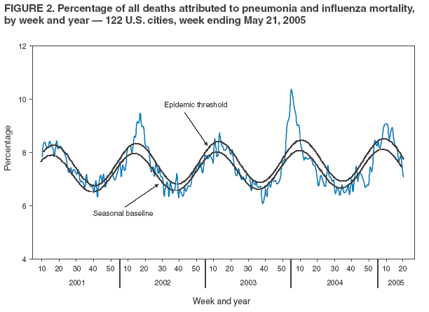 * Includes both the A (H1N1) and A (H1N2) influenza virus types. Defined as temperature of >100.0º F (>37.8º C) and either cough or sore throat in the absence of a known cause other than influenza. § The national baseline was calculated as the mean percentage of patient visits for ILI during non-influenza weeks plus two standard deviations. Wide variability in regional data precludes calculating region-specific baselines and makes it inappropriate to apply the national baseline to regional data. National and regional percentages of patient visits for ILI are weighted on the basis of state population. ¶ Levels of activity are 1) no activity; 2) sporadic: isolated laboratory-confirmed influenza cases or laboratory-confirmed outbreak in one institution, with no increase in activity; 3) local: increased ILI in one region, or at least two institutional outbreaks (ILI or laboratory-confirmed influenza) in one region; virus activity no greater than sporadic in other regions; 4) regional: increased ILI activity or outbreaks (ILI or laboratory-confirmed influenza) in at least two but fewer than half of the regions in the state; and 5) widespread: increased ILI activity or outbreaks (ILI or laboratory-confirmed influenza) in at least half the regions in the state. ** Active prospective surveillance in EIP and NVSN for the 2004--05 influenza season ended as of April 30, 2005. NVSN provides population-based estimates of laboratory-confirmed influenza hospitalization rates in children aged <5 years admitted to NVSN hospitals with fever or respiratory symptoms. Children are prospectively enrolled, and respiratory samples are collected and tested by viral culture and reverse transcriptase-polymerase chain reaction (PCR). EIP conducts surveillance for laboratory-confirmed, influenza-related hospitalizations in person aged <18 years. Hospital laboratory and admission databases and infection-control logs are reviewed to identify children with a positive influenza test result (i.e., culture, direct or indirect fluorescent antibody assays, PCR, or a rapid test) from testing conducted as a part of their routine care. §§ The expected seasonal baseline proportion of P&I deaths reported by the 122 Cities Mortality Reporting System is projected by using a robust regression procedure in which a periodic regression model is applied to the observed percentage of deaths from P&I during the previous 5 years. The epidemic threshold is 1.654 standard deviations above the seasonal baseline.