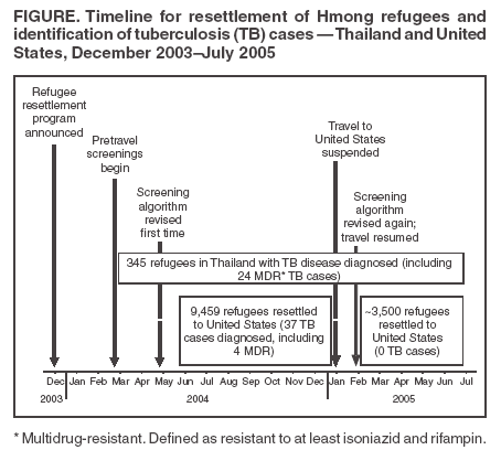 Persons using assistive technology might not be able to fully access information in this file. For assistance, please send e-mail to: mmwrq@cdc.gov. Type 508 Accommodation and the title of the report in the subject line of e-mail. Multidrug-Resistant Tuberculosis in Hmong Refugees Resettling from Thailand into the United States, 2004--2005In December 2003, the U.S. Department of State initiated a resettlement program for 15,707 Hmong refugees who had been displaced from Laos and were living on the grounds of Wat Tham Krabok, a Buddhist temple in Thailand. In January 2005, reports of tuberculosis (TB) cases among refugees still in Thailand and refugees who had arrived in the United States, including some cases caused by multidrug-resistant* (MDR) strains, prompted a 1-month travel suspension. After enhanced screening in Thailand and intensified TB-control measures in the United States, resettlement resumed on February 16. A majority of the Hmong refugees in Thailand and the United States with TB diagnosed were started on treatment and monitored. As of July 15, no additional TB cases had been diagnosed among newly resettled Hmong refugees. U.S. health departments should continue to ensure careful monitoring for TB among this refugee group. Approximately 50,000--70,000 refugees resettle in the United States each year (1). Before resettlement, all refugees undergo medical screening to prevent importation of diseases that pose an immediate public health risk. The standard TB-screening algorithm, used in early 2004 to evaluate Hmong refugees in Thailand, includes a medical history and physical examination for all applicants and a chest radiograph for persons aged >15 years. Applicants with clinical or radiologic findings suggestive of TB disease submit three sputum specimens for acid-fast bacilli (AFB) smear microscopy. Those with positive results must begin anti-TB treatment and have follow-up specimens with consistently smear-negative results before travel to the United States is allowed. The standard premigration algorithm was revised in May 2004 to add requirements for mycobacterial culture and drug-susceptibility testing. During June 2004--January 2005, the United States resettled 9,459 Hmong refugees in 20 states (Table and Figure). As the newly arrived refugees underwent health assessments at local health departments and in private health-care facilities, 37 TB cases, including four MDR cases, were reported. This finding coincided with assessments in Thailand, where 17 (33%) of 52 culture-confirmed cases among refugees were determined to be MDR. In contrast, among all new TB cases reported in the United States during 2004 with drug-susceptibility results, 1% were MDR TB (2). Hmong refugee travel to the United States was suspended to allow for epidemiologic investigation and to prevent further importation of TB cases. In January 2005, coordinated investigations were conducted in Thailand and the United States by the International Organization for Migration, CDC, the Thailand Ministry of Public Health, the U.S. Department of State, the U.S. Department of Health and Human Services Office of Global Health Affairs, and state and local health departments to describe the epidemiology of TB disease and to direct TB-control measures among the refugees. The case definition for TB disease required either 1) bacteriologic evidence (i.e., sputum-smear microscopy or culture) or 2) a decision to initiate TB treatment in the context of radiographic abnormalities or clinical features consistent with TB. ThailandThe investigation in Thailand began with an evaluation of laboratory procedures, which excluded the possibility of false-positive culture results. Medical records of patients being treated for TB disease were reviewed, and all known patients were interviewed. Patient living quarters were mapped with global positioning system (GPS) technology to assess for potential geographic clustering of cases. Classmates of refugee children and other non-Hmong contacts were screened by chest radiograph and, if indicated, by sputum-smear microscopy. During March 2004--January 2005, a total of 272 refugees, including 11 (4%) children aged <15 years, received a diagnosis of TB disease. Thirty (11%) of the 261 persons aged >15 years had AFB sputum-smear--positive pulmonary TB. One person tested positive for human immunodeficiency virus (HIV), 258 tested negative, and results for two persons were unknown. Children aged <15 years were not routinely tested for HIV. Medical records and interviews revealed that three (18%) of the 17 culture-confirmed MDR TB patients had been treated previously for TB disease. Nine (53%) reported at least weekly contact with another MDR TB patient, and seven were linked through a social network that centered around a patient with sputum-smear--positive MDR TB. GPS mapping revealed widespread distribution of TB cases throughout the Hmong living quarters in Wat Tham Krabok (an area of 0.5 km2). No additional smear-positive TB cases were detected during screenings of classmates and other non-Hmong contacts in Thailand (n = 327). In February 2005, the premigration screening algorithm for Hmong refugees was revised again. All refugees aged >6 months were rescreened with chest radiographs, and those aged 6 months to 10 years also underwent tuberculin skin testing. In addition, laboratory capacity was increased with addition of automated culture methods, access to MDR TB medications was ensured, and a team of physicians and nurses was established to provide expert case management for TB patients. Since the implementation of this enhanced algorithm, an additional 73 cases of TB disease have been diagnosed, including seven cases of MDR TB, resulting in an overall total of 345 TB cases (including 24 MDR). Patients are permitted to travel to the United States only after they have completed anti-TB treatment. As of July 15, a total of 341 Hmong refugees in Thailand had undergone treatment for TB di