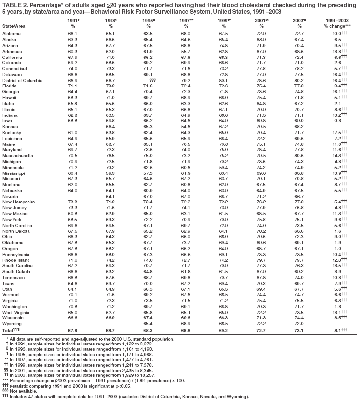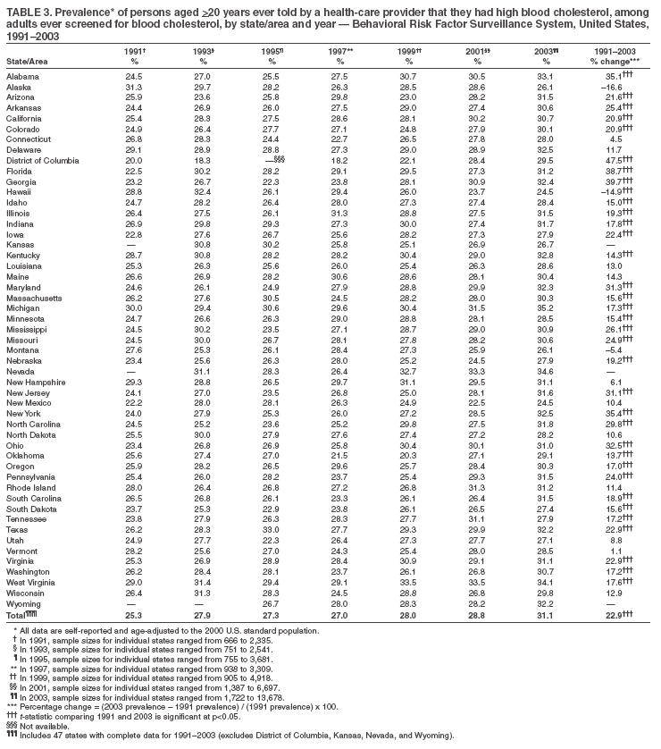 Persons using assistive technology might not be able to fully access information in this file. For assistance, please send e-mail to: mmwrq@cdc.gov. Type 508 Accommodation and the title of the report in the subject line of e-mail. Trends in Cholesterol Screening and Awareness of High Blood Cholesterol --- United States, 1991--2003High blood cholesterol (HBC) (i.e., total cholesterol >240 mg/dL) is a major risk factor for heart disease, the leading cause of death in the United States (1). As a result, public health agencies and their partners have attempted to reduce the prevalence of HBC through screening and by increasing public awareness of HBC and strategies for reducing it. A national health objectives of Healthy People 2010 is to increase to 80% the proportion of adults aged >20 years who have been screened for HBC within the preceding 5 years (2). For this report, data from the Behavioral Risk Factor Surveillance System (BRFSS) collected during 1991--2003 were analyzed to examine trends in the percentage of adults screened for HBC and the percentage of those screened who were told they had HBC. The findings indicated that both percentages increased during 1991--2003 but that few states had achieved the national health objective for screening. Further emphasis on cholesterol screening is needed, particularly among Hispanic and Asian/Pacific Islander populations and young adults. BRFSS is a state-based, random-digit--dialed telephone surveillance system that samples the noninstitutionalized, U.S. civilian population aged >18 years. For this report, CDC analyzed BRFSS data from 1991, 1993, 1995, 1997, 1999, 2001, and 2003 for 1,027,793 persons aged >20 years. Response rates for BRFSS surveys ranged from 71.4% in 1993 to 51.1% in 2001 (3). Survey participants were asked whether they had ever had a blood cholesterol screening and, if so, how long it had been since their last screening. Those who reported having ever been screened were asked whether they had ever been told by a health-care professional that they had HBC. Data were weighted to account for age, race/ethnicity, and sex distributions of the population in each state. Statistical software was used to account for the complex sampling design. The results were age-standardized to the 2000 U.S. standard population (4). Percentage change was calculated as the 2003 prevalence minus the 1991 prevalence divided by the 1991 prevalence multiplied by 100. During 1991--2003, the prevalence of cholesterol screening during the preceding 5 years and the percentage of persons screened who were told they had HBC increased overall and among all age, sex, and racial/ethnic groups (Table 1). The percentage of those screened within 5 years increased from 67.6% (95% confidence interval [CI] = 67.2--68.1) in 1991 to 73.1% (CI = 72.7--73.4) in 2003. Although the prevalence of cholesterol screening within 5 years was higher among women than men in all years represented, the percentage change in prevalence was smaller for women than men. In 2003, the prevalence of cholesterol screening was lowest among Hispanics (65.5%; CI = 64.1--67.0) and Asians/Pacific Islanders (69.6%; CI = 66.9--72.4). The largest percentage changes in prevalence of cholesterol screening were among American Indians/Alaska Natives and non-Hispanic blacks. The overall percentage of those screened who had been told they had HBC increased from 25.3% (CI = 24.7--25.8) in 1991 to 31.1% (CI = 30.7--31.5) in 2003. The percentage change among men told they had HBC was more than twice that among women. The percentage of those screened who were told they had HBC was higher in all racial/ethnic groups in 2003 than in 1991, with the greatest increase observed among Hispanics. Similarly, reporting of HBC increased among all age groups, with the largest percentage change in prevalence among those aged >65 years. In 46 states and the District of Columbia (DC), the prevalence of screening increased from 1991 to 2003, with percentage change ranging from 0.3% in Iowa to 17.5% in Kentucky (Table 2). However, by 2003, only DC and Massachusetts had achieved the Healthy People 2010 objective for cholesterol screening, with rates of 80.2% and 80.6%, respectively. The proportion of screened adults who had been told they had HBC increased in 44 states and DC, with increases ranging from 1.1% in Vermont to 47.5% in DC (Table 3). Reported by: AE Saddlemire, CH Denny, PhD, KJ Greenlund, PhD, JN Coolidge, MPH, AZ Fan, MD, PhD, JB Croft, PhD, Div for Heart Disease and Stroke Prevention, National Center for Chronic Disease Prevention and Health Promotion, CDC. Editorial Note:The findings in this report indicate that the overall percentage of adults who had had their cholesterol checked during the preceding 5 years increased during 1991--2003. However, in most states, increases in screening were moderate; by 2003, only DC and Massachusetts had achieved the Healthy People 2010 objective of 80% screening prevalence. Among those persons who had ever undergone cholesterol screening, the percentage told that they had HBC also increased during 1991--2003. The largest increase in the prevalence of HBC screening occurred during 1999--2001 (5.1%), and in most states, the prevalence of screening continued to increase during 2001--2003. The overall increase in cholesterol screening might have been attributable, in part, to 1) implementation of state heart-disease and stroke-prevention programs by CDC beginning in 1998 (5); 2) release, in 2000, of Healthy People 2010, with the objective to increase the proportion of adults who have had their blood cholesterol checked during the preceding 5 years (2); and 3) publication of the National Cholesterol Education Program Adult Treatment Panel (ATP) II (1993) and ATP III (2001) reports, which updated clinical guidelines for cholesterol testing and management (6,7). In addition, the large increase in prevalence of screening among American Indians/Alaska Natives might be the result of
