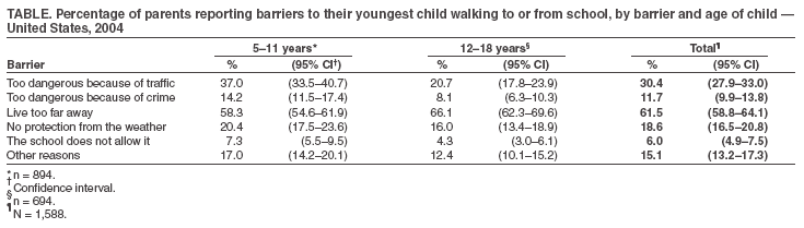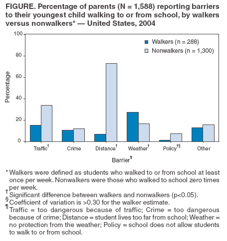 Persons using assistive technology might not be able to fully access information in this file. For assistance, please send e-mail to: mmwrq@cdc.gov. Type 508 Accommodation and the title of the report in the subject line of e-mail. Barriers to Children Walking to or from School --- United States, 2004Walking for transportation is part of an active lifestyle that is associated with decreased risks for heart disease, diabetes, hypertension, and colon cancer and an increased sense of well being (1). However, the percentage of trips made by walking has declined over time among both children (2) and adults (3). One of the objectives of Healthy People 2010 (no. 22-14b) is to increase among children and adolescents the proportion of trips to school made by walking from 31% to 50% (4). In 1969, approximately half of all schoolchildren walked or bicycled to or from school, and 87% of those living within 1 mile of school walked or bicycled (5). Today, fewer than 15% of children and adolescents use active modes of transportation (2). This report examines data from the 2004 ConsumerStyles Survey and a follow-up recontact survey to describe what parents report as barriers to their children aged 5--18 years walking to or from school. Distance to school was the most commonly reported barrier, followed by traffic-related danger. Comprehensive initiatives that include behavioral, environmental, and policy strategies are needed to address these barriers to increase the percentage of children who walk to school. The ConsumerStyles and recontact surveys are conducted annually by a market-research firm with technical assistance from CDC. For the ConsumerStyles survey, stratified random sampling (by region, household income, population density, age, and household size) was used to identify 10,000 potential respondents from a larger consumer-mail panel of approximately 600,000 adults aged >18 years. A low income/minority supplement and a households-with-children supplement were used to ensure adequate numbers of respondents from those groups. Of the 10,000 identified, 6,207 responded to the initial survey (62% response rate). The recontact survey was mailed to all respondents within 4--6 months of the initial survey and had a 68% response rate (N = 4,213). For that survey, parents of children aged 5--18 years were asked how many times their youngest child walks to or from school during a usual week and whether one or more of six barriers (too dangerous because of traffic, too dangerous because of crime, live too far away, no protection from the weather, the school does not allow it, and other reasons) prevents that child from walking to school. Results were weighted to reflect the age, race/ethnicity, sex, income, and household size of the U.S. adult population, as determined by the 2000 U.S. Census. Of the 1,705 adults who reported having a child aged 5--18 years, 1,588 (93%) answered the walk-to-school questions for their youngest child. Approximately 17% reported that their child walked to or from school at least once per week during a usual week. Among students who walked to school, the average number of trips per week to or from school was 7.1 (range: 1--10). The percentage of students who walked to or from school was higher among those aged 5--11 years than among those aged 12--18 years (18.7% versus 15.3%); this difference was not significant (p = 0.08). The most commonly reported barrier was distance to school (61.5%), followed by traffic-related danger (30.4%), then weather (18.6%). Fifteen percent of parents cited an "other" barrier, 11.7% reported crime as a barrier, and 6.0% reported school policy as a barrier; 15.9% (95% CI = 14.1%--18.0%) of parents selected the response, "It is not difficult for my child to walk to school." The frequency with which barriers were reported by parents varied slightly by age (5--11 years versus 12--18 years), although the relative ranking of the barriers did not differ by age (Table). Barriers also varied by walking status (walker versus nonwalker), with the largest difference observed for distance (72.9% [CI = 70.1%--75.5%] versus 6.8% [CI = 4.5%--10.4%]) (Figure). Reported by: S Martin, S Carlson, Div of Nutrition and Physical Activity, National Center for Chronic Disease Prevention and Health Promotion, CDC. Editorial Note:In this study, distance to school was the most commonly cited barrier to walking to and from school. A similar study conducted in 1999 (6) also found distance to be the most commonly cited barrier (55%). This finding might be attributable, in part, to an increase of 2 million students from 1969 to 2001 with a corresponding decrease in the number of schools, from 70,879 in 1969 to 69,697 in 2001 (7). As a result, a greater percentage of students might live farther than 1 mile from their schools. Study results also indicated that students aged 5--11 years were more likely to walk to school than were those aged 12--18 years; however, this difference was not significant. One possible reason for this difference is that elementary schools are likely to be closer to children's homes because they outnumber junior and senior high schools in the United States (more than 70,000 elementary schools compared with approximately 28,000 junior and senior high schools) (7). This hypothesis is supported by the finding that parents of older children more frequently cited distance as a barrier, whereas parents of younger children more frequently cited other barriers. The findings in this report are subject to at least three limitations. First, the data are subject to sampling biases because data could be collected only from parents who chose to respond to the survey. Second, because the age of each respondent's youngest child was derived from the ConsumerStyles survey, which was mailed 4--6 months earlier, some of the children's ages might have been misclassified. Finally, the survey did not ask parents how far the child lived from school, about whether the child at