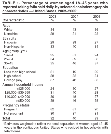 Persons using assistive technology might not be able to fully access information in this file. For assistance, please send e-mail to: mmwrq@cdc.gov. Type 508 Accommodation and the title of the report in the subject line of e-mail. Use of Dietary Supplements Containing Folic Acid Among Women of Childbearing Age --- United States, 2005Neural tube defects (NTDs) are serious birth defects of the spine (spina bifida) and brain (anencephaly), affecting approximately 3,000 pregnancies each year in the United States (1). Daily periconceptional consumption of 400 µg of folic acid, as recommended by the Public Health Service (PHS) since 1992, reduces the occurrence of NTDs by 50%--70% (2). The Food and Drug Administration ordered mandatory fortification with folic acid of U.S. cereal grain products, beginning in 1998. However, despite a 26% reduction in NTDs, not all women of childbearing age receive adequate levels of folic acid from their diets (1). Therefore, increasing the number of women who take dietary supplements containing 400 µg of folic acid daily remains an important component of NTD prevention (3). This report summarizes results from the 2005 March of Dimes Gallup survey, which determined a decrease in the proportion of childbearing-aged women who reported taking folic acid in dietary supplements daily,* from 40% in 2004 to 33% in 2005, returning to a level consistent with that reported during 1995--2003 (Figure). These results emphasize the need for innovative programs to increase folic acid consumption to further reduce NTDs. The Gallup survey has been conducted since 1995 using a random-digit--dialed telephone interview of a proportionate stratified sample. Response rate for the 2005 survey was 32%, with 2,647 women aged 18--45 years responding; response rates for previous surveys ranged from 24% to 52%. Statistical estimates were weighted to reflect the total population of women aged 18--45 years in the contiguous United States who resided in households with telephones. The margin of error for estimates based on the total sample was +2%. To assess awareness of folic acid, respondents were asked, "Have you ever heard, read, or seen anything about folic acid?" To assess knowledge about folic acid, respondents were asked, "What have you heard, read, or seen about folic acid?" In addition, the survey asked questions regarding motivating factors and barriers to taking folic acid. In the 2005 survey, 33% of women of childbearing age reported taking folic acid daily, compared with 40% in 2004. This decrease was consistent across most demographic characteristics, with nonwhite, young, less educated, and lower-income women the least likely to report taking folic acid daily (Table 1). The percentage of women reporting awareness of folic acid increased from 78% in 2004 to 84% in 2005, an all-time high for the survey. However, the percentage of women knowing that folic acid prevents birth defects remained unchanged at 25%, and the percentage of women knowing that folic acid should be taken before pregnancy decreased from 12% in 2004 to 7% in 2005, the lowest percentage since 1997 (Figure). Twenty-six percent of women aged 18--45 years reported dieting during the preceding 6 months, relatively unchanged from 24% in 2004 (4). Of the women reporting dieting, 37% were taking folic acid daily and were nearly 30% more likely to be taking folic acid than nondieters (odds ratio [OR] = 1.27; 95% confidence interval [CI] = 1.13--1.41). Dieters were 50% more likely than nondieting women to believe that folic acid is important for women of childbearing age (OR = 1.50; CI = 1.34--1.68). Twenty-seven percent of dieting women reported being on low-carbohydrate diets, down substantially from 48% in 2004. Of the women on low-carbohydrate diets, 37% reported taking folic acid daily, down from 49% in 2004 (Table 2). In addition, 37% of women on other diets reported taking folic acid daily, down from 40% in 2004. Whereas in 2004 women on low-carbohydrate diets were 50% more likely to take folic acid daily than women on other diets, in 2005 folic acid consumption was similar among women in the two dieting groups (OR = 1.00; 95% CI = 0.81--1.24. Although in 2004, low-carbohydrate dieters were 30% more likely to believe that folic acid is important for women of childbearing age than women on other diets, in 2005, no difference was evident between women in these dieting groups (OR = 0.95; 95% CI = 0.76--1.18). Women were asked questions to determine why they do or do not take vitamin or mineral supplements. Women who did not report taking supplements were asked, "Why do you not take any vitamin or mineral supplements on a daily basis?" The most common barriers women noted were forgetting to take supplements (28%), perceiving they do not need them (16%), and believing they get needed nutrients and vitamins from food (9%). In 2005, to determine what might motivate women not taking vitamins or supplements to begin taking folic acid daily, respondents were asked, "For what specific need would you start taking a vitamin or mineral supplement?" The most common reported needs were being sick or in poor health (20%), a doctor's recommendation (20%), the need for energy (9%), being pregnant (8%), being deficient in any vitamins or minerals (7%), balancing the diet (6%), and keeping bones strong (6%). In addition, 11% cited no specific need that would motivate them to begin taking a vitamin or supplement. Among women who reported not consuming a vitamin or mineral supplement daily, 31% indicated they had received a doctor's recommendation. Older women were more likely to report receiving a doctor's recommendation (aged 35--45 years, 38%; 25--35 years, 38%; 18--24 years, 24%). Reported by: LLM Lindsey, PhD, CDC Foundation, Atlanta, Georgia. JR Petrini, PhD, March of Dimes Birth Defects Foundation, White Plains, New York. H Carter, MPH, C Prue, PhD, J Mulinare, MD, Div of Birth Defects and Developmental Disabilities, National
