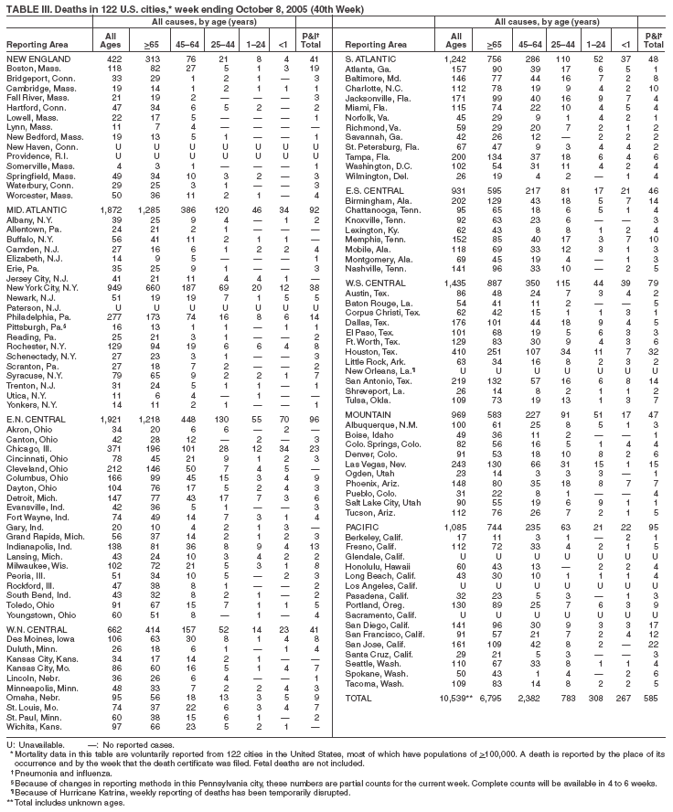 Table III   Deaths in 122 U.S. cities, week ending October 8, 2005 (40th Week)