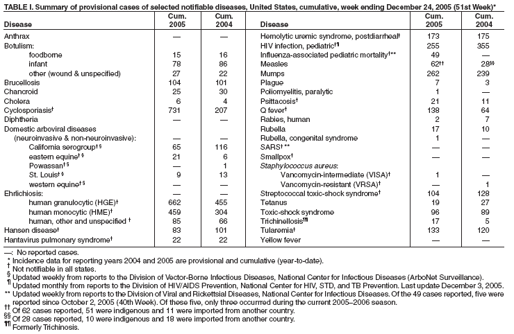Table I   Summary of provisional cases of selected notifiable diseases, United States, cumulative, week ending December 24, 2005 (51st Week)