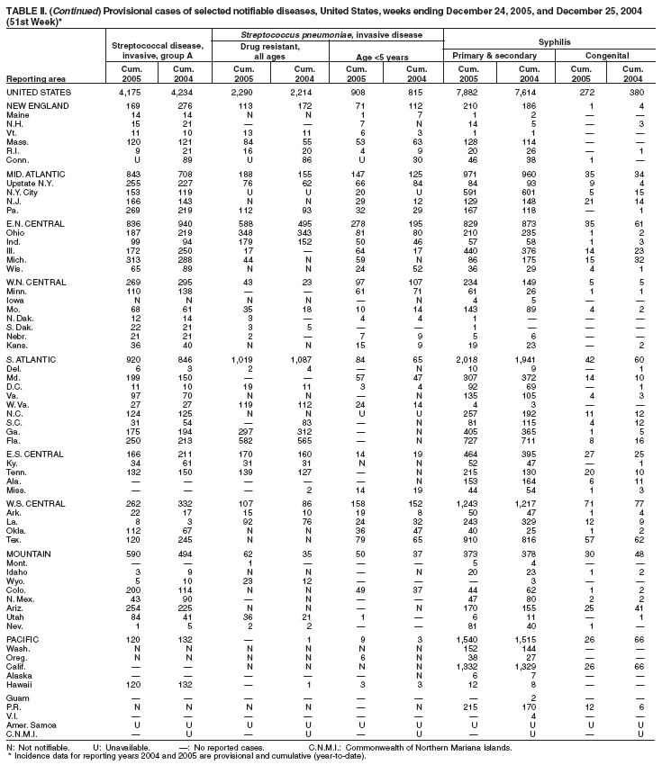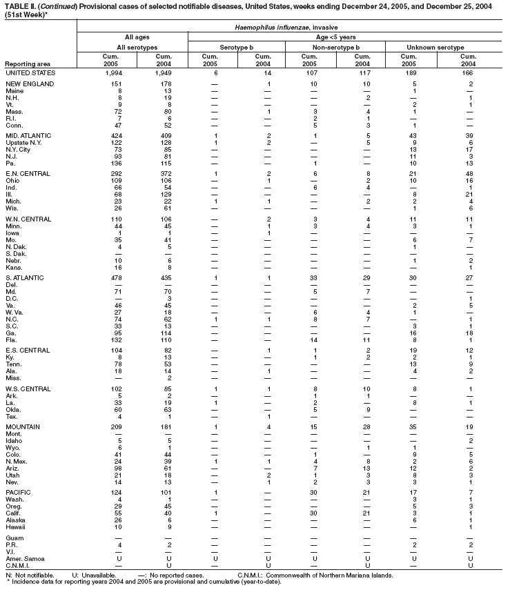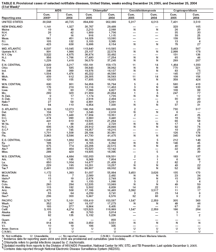Table II   Provisional cases of selected notifiable diseases, United States, weeks ending December 24, 2005 and December 25, 2004 (51st Week)