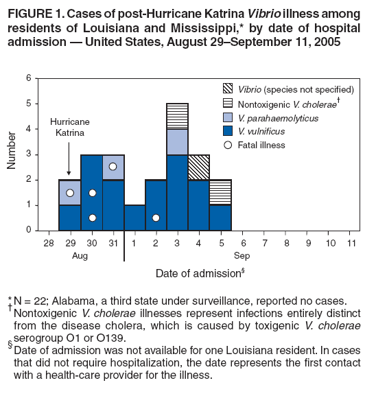 onset after September 5; additional Vibrio cases are under investigation. Wound-Associated IllnessesEighteen wound-associated Vibrio cases were reported, in residents of Mississippi (seven) and Louisiana (five); in persons displaced from Louisiana to Texas (two), Arkansas (two), and Arizona (one); and in a person displaced from Mississippi to Florida (one). Speciation was performed in clinical laboratories for 17 of the wound-associated cases; 14 (82%) were V. vulnificus, and three (18%) were V. parahaemolyticus. Five (28%) patients with wound-associated Vibrio infections died; three deaths were associated with V. vulnificus infection, and two were associated with V. parahaemolyticus infection. Age of patients with wound-associated illnesses ranged from 31 to 89 years (median: 73 years). Fifteen (83%) were male. The majority of patients were hospitalized; admission dates ranged from August 29 to September 5. Not all patients were initially hospitalized because of their wounds. An underlying condition that might have increased risk for severe Vibrio illness was reported in 13 (72%) of the patients with wounds; these conditions included heart disease (seven patients), diabetes mellitus (four), renal disease (three), alcoholism (three), liver disease (two), peptic ulcer disease (one), immunodeficiency (one), and malignancy (one). Non-Wound–Associated IllnessesFour persons were reported with non-wound–associated Vibrio infections (two in Mississippi, one in Louisiana, and one displaced from Louisiana to Arizona). Information on the Vibrio species and clinical illness was available for two of these patients; the species were nontoxigenic V. cholerae isolated from patients with gastroenteritis. One of the infections occurred in a boy aged 2 months with diarrhea whose stool culture yielded both Salmonella group C2 and V. cholerae non- O1, non-O139. He was hospitalized for 2 days in Mississippi. The other V. cholerae non-O1, non-O139 isolate was from a stool specimen from an adult who was not hospitalized. No deaths were associated with the non-wound cases. Case ReportsTo illustrate the rapid onset and severity of Vibrio wound infections, brief descriptions of three of the cases are provided. Patient A. A man aged 60 years with a history of stroke, hypertension, and alcohol abuse arrived in Texas on August 31, after spending 3 days wading in the floodwaters of New Orleans, Louisiana. He was not housed at an evacuation center. On September 1, 2005, the man visited an emergency department with bilateral ankle wounds and diarrhea; he was treated and released. No details regarding treatment were available. Blood cultures subsequently yielded V. vulnificus. The patient was located and admitted to the hospital on September 2. He died the next day. Patient B. A man aged 61 years from Mississippi with human immunodeficiency virus infection, coronary artery disease, and hyperlipidemia was examined on August 29 and determined to have hypothermia and multiple second- and third-degree abrasions on his trunk. V. parahaemolyticus was isolated from his blood. Despite receiving antimicrobial therapy with levofloxacin, he died the next day. Patient C. A woman aged 49 years reported by her family to have hepatitis C was evacuated from New Orleans after a boat rescue. She visited an Arkansas hospital on September 4 with bullae, septic shock, and necrotizing fasciitis on her left leg, which was extensively debrided. V. vulnificus was isolated from her blood. As of September 12, she was being treated with ceftazidime and doxycycline and remained in critical condition. Reported by: D Engelthaler, MS, K Lewis, MD, S Anderson, MPH, Arizona Dept of Health Svcs. S Snow, MD, L Gladden, Arkansas Dept of Health. RM Hammond, PhD, RJ Hutchinson, Florida Dept of Health. R Ratard, MD, S Straif-Bourgeois, PhD, T Sokol, MPH, A Thomas, MPH, Louisiana Office of Public Health. L Mena, MD, J Parham, MD, School of Medicine, Univ of Mississippi Medical Center, Jackson; S Hand, M McNeill, MD, PhD, P Byers, MD, B Amy, MD, Mississippi Dept of Health. G Charns, Medical City Hospital of Dallas; J Rolling, A Friedman, J Romero, MPH, T Dorse, MD, J Carlo, MD, Dallas County Health and Human Svcs Dept; S Stonecipher, DVM, LK Gaul, PhD, T Betz, MD, Dept of State Health Svcs. RL Moolenar, MD, National Center for Environmental Health; JA Painter, DVM, MJ Kuehnert, MD, J Mott, PhD, DB Jernigan, MD, PA Yu, MPH, TA Clark, MD, National Center for Infectious Diseases; SK Greene, PhD, AM Schmitz, DVM, AC Cohn, MD, JL Liang, DVM, EIS officers, CDC. Editorial Note:After natural disasters such as Hurricane Katrina, the risk for illness related to infectious diseases is a public health concern. The findings in this report describe illnesses caused by Vibrio species, including wound infections resulting from post-hurricane exposure of wounds to flood waters. These findings underscore the need for prompt recognition and management of Vibrio wound infections by healthcare providers. When the number of illnesses from infectious diseases increases after a natural disaster, they usually are caused by infectious agents normally present in the community or local environment (1). Nationwide, an average of 412 cases of noncholeragenic Vibrio* illnesses were reported each year during 2000–2004, including an average of 146 cases reported from the five Gulf Coast states (2). The most frequently reported Vibrio species are V. parahaemolyticus, V. vulnificus, and nontoxigenic V. cholerae. Vibrio illnesses in the United States are seasonal and peak during the summer (Figure 2). During 2000–2004, in the month of September, an average of 14 (range: 11–18) noncholeragenic Vibrio infections were reported from Gulf Coast states; an average of seven cases (range: 4–8) were wound-associated. Except for toxigenic V. cholerae O1 or O139, Vibrio illnesses are not nationally notifiable in the United States, and the actual number of noncholeragenic Vibrio illnesses is like