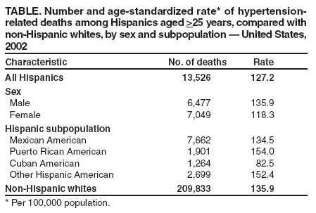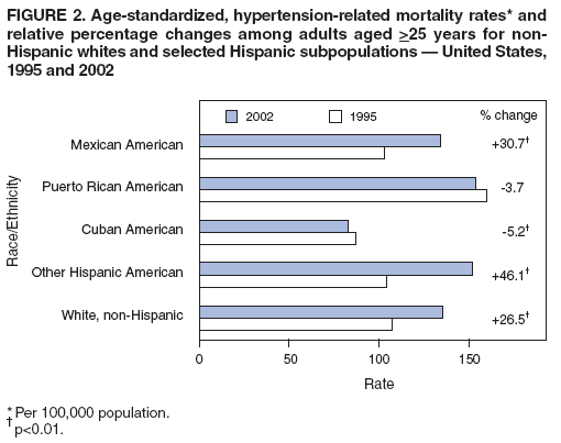 Persons using assistive technology might not be able to fully access information in this file. For assistance, please send e-mail to: mmwrq@cdc.gov. Type 508 Accommodation and the title of the report in the subject line of e-mail. Hypertension-Related Mortality Among Hispanic Subpopulations --- United States, 1995--2002Hypertension remains a major public health problem in the United States even though effective therapy has been available for more than 50 years (1). Hypertension is a strong independent risk factor for heart disease and stroke and a predictor of premature death and disability from cardiovascular complications (2). Although age-adjusted prevalence of hypertension is lower among Hispanics than among blacks or non-Hispanic whites (3--5), recent data indicate that certain Hispanic subpopulations (Mexican Americans, Puerto Rican Americans, Cuban Americans, and other Hispanic Americans) are characterized by low levels of hypertension awareness, treatment, and control. Because Hispanics are the fastest growing and youngest racial/ethnic population in the United States (6), targeted strategies to reduce morbidity and mortality rates among this population are essential. Since 1995, information on Hispanic ethnicity has been provided on nearly all death certificates issued in the United States.* Although data on Hispanic subpopulations are also available on death certificates, no national mortality statistics on hypertension-related deaths among specific Hispanic subpopulations have been published. To compare age-standardized, hypertension-related death rates among Hispanic subpopulations, CDC analyzed death certificate data from 1995 and 2002. This report describes the results of that analysis, which indicated that Puerto Rican Americans had consistently higher hypertension-related mortality (HRM) rates than all other Hispanic subpopulations and non-Hispanic whites. Comprehensive hypertension prevention and control programs are needed to target these Hispanic subpopulations. National death certificate data were obtained from the multiple cause-of-death files compiled by CDC. Most analyses of mortality data are based on the underlying cause of death (i.e., the disease or injury that initiated the sequence of events leading directly to death). However, hypertension is not only an important underlying cause of death but also is a common complicating factor for other disease. Therefore, in this report, hypertension-related mortality (HRM) includes those deaths for which hypertension (International Classification of Diseases, Ninth Revision (ICD-9) codes 401-404 for 1995 and ICD-10 codes I10-I13 for 2002) was reported either as the underlying cause or as a contributory cause of death (i.e., a condition reported on the death certificate other than the underlying cause). Included are deaths attributed to essential hypertension (i.e., high blood pressure with no identifiable cause), hypertensive heart disease, hypertensive renal disease, hypertensive heart and renal disease, and secondary hypertension. This report was limited to deaths occurring in the 50 states and the District of Columbia among U.S. residents aged >25 years. Age-standardized death rates based on the 2000 U.S. standard population were estimated for non-Hispanic whites, Hispanics, and four Hispanic subpopulations (Mexican Americans, Puerto Rican Americans, Cuban Americans, and other Hispanic Americans). Population denominators from the U.S. Census Bureau used to calculate death rates included postcensal estimates of the U.S. resident population for 2002 and intercensal population estimates for 1995. The change in HRM from 1995 to 2002 among Hispanic subpopulations was defined as the percentage change in age-standardized death rates. Non-Hispanic whites were the referent group for all estimates of HRM disparity. In 2002, a total of 13,526 hypertension-related deaths were reported among all Hispanics, compared with 209,833 among all non-Hispanic whites. The age-standardized HRM rate was 127.2 per 100,000 population for all Hispanics, similar to that of non-Hispanic whites (135.9). The age-standardized HRM rate for Hispanic women (118.3) was substantially lower than that observed for Hispanic men (135.9) (Table). Male HRM rates were higher than female rates for all Hispanic subpopulations. Puerto Rican Americans had the highest death rate among all Hispanic subpopulations (154.0), and Cuban Americans had the lowest (82.5). Compared with non-Hispanic whites, Puerto Rican Americans had 13% (p<0.01) higher age-standardized HRM rates; other Hispanic Americans were 12% (p<0.01) higher. Age-standardized HRM rates for Cuban Americans were 39% lower (p<0.01) than those for non-Hispanic whites. Rates for Mexican Americans did not differ significantly from non-Hispanic whites (95% CI = 0.97--1.01) (Figure 1). In 1995, age-standardized HRM rates (per 100,000 population) were highest among Puerto Rican Americans (159.9), followed by non-Hispanic whites (107.4), other Hispanic Americans (104.3), Mexican Americans (102.9), and Cuban Americans (87.0) (Figure 2). HRM rates increased for Mexican and other Hispanic Americans but decreased for Puerto Rican and Cuban Americans. The greatest percentage increase from 1995 to 2002 was 46.1% (p<0.01) for other Hispanic Americans, followed by increases of 30.7% (p<0.01) for Mexican Americans and 26.5% (p<0.01) for non-Hispanic whites. A 5.2% (p<0.01) decrease occurred from 1995 to 2002 among Cuban Americans, and a 3.7% decrease was observed among Puerto Rican Americans. Reported by: C Ayala, PhD, MR Moreno, MPH, JA Minaya, MPH, JB Croft, PhD, GA Mensah, MD, Div of Adult and Community Health, National Center for Chronic Disease Prevention and Health Promotion; RN Anderson, PhD, National Center for Health Statistics, CDC. Editorial Note:HRM rates increased substantially in the United States during 1995--2002, especially among the Hispanic population. This trend is most evident among Mexican Americans a