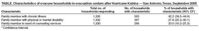 Persons using assistive technology might not be able to fully access information in this file. For assistance, please send e-mail to: mmwrq@cdc.gov. Type 508 Accommodation and the title of the report in the subject line of e-mail. Rapid Assessment of Health Needs and Resettlement Plans Among Hurricane Katrina Evacuees --- San Antonio, Texas, September 2005Hurricane Katrina struck the coastal regions of Alabama, Florida, Louisiana, and Mississippi on August 29, 2005, resulting in one of the worst natural disasters in U.S. history (1,2). The city of New Orleans, Louisiana, was further damaged by severe flooding when major levees broke and released water from Lake Pontchartrain. Residents were evacuated to neighboring states and cities, including San Antonio, Texas. On September 3, 2005, approximately 12,700 evacuees arrived in San Antonio and were housed in four primary evacuation centers (ECs). Although many evacuees in San Antonio soon found other accommodations, as of September 16, 2005, approximately 3,700 evacuees remained in ECs awaiting resumption of public services in New Orleans. To assess evacuee needs for clinical care, public health services, and housing assistance, the San Antonio Metropolitan Health District (Metro Health) requested CDC assistance to conduct a needs assessment of heads of households in the ECs. This report summarizes the findings of that survey, which identified substantial numbers of evacuees with chronic health conditions, physical or mental disabilities, and needs for counseling and housing assistance. The findings underscore the need to augment local public health and public assistance resources to address ongoing health and housing needs of evacuee populations. Assessment MethodsSurvey data were collected for 4 days (September 15, 16, 17, and 19), during which the American Red Cross (ARC) distributed monetary aid to all heads of households in the four main San Antonio ECs (an empty warehouse and an office building at a former Air Force Base, an empty clothing distribution center, and an empty department store at a suburban shopping mall). Heads of households were identified and assigned special wristbands. ARC distributed aid at a different EC each day for 4 days. Interviews were conducted by trained public health practitioners and medical student volunteers and by CDC and Metro Health staff while heads of households were waiting to be processed. Interviewers clarified that participation in the survey did not affect eligibility to receive ARC aid. Identifying information was not collected. Respondents were asked about 1) basic demographic information and household size, 2) settlement plans, and 3) whether any household members had chronic medical conditions, physical or mental disabilities, or counseling needs. The heads of households were asked to report the number of persons in their household who had a condition that requires them to visit a health-care provider regularly or a physical or mental disability. Those reporting one or more members with a condition were counted as a household with a family member having the condition. Assessment ResultsInterviews were completed with 1,360 heads of households who resided in ECs. According to ARC estimates of the daily EC census, approximately 75% of all heads of households were recruited. The response rate was 95%. Response rates and recruitment rates were similar each day for each EC. The highest nonresponse rate for any individual question was 9.4%. Respondents were 55% male, with a median age of 46 years (range: 18--89 years). Eighty-nine percent of respondents were black, 6% were white, 2% were Hispanic, and 3% were of other race/ethnicity. Median household size was two persons (range: one to 11); 46% of all households contained a single person. Ninety-one percent of those surveyed were from a New Orleans postal code. Approximately 51% (714) of heads of households reported holding jobs in unskilled professions (e.g., food service, manual labor, housekeeping, or retail sales), whereas 21% (290) reported working in skilled occupations (e.g., health care, education, or law enforcement). The remaining heads of households were unemployed (10%), retired (8%), or receiving Social Security or disability benefits (11%) before evacuation. Among 3,286 total evacuees in surveyed households, the median age was 32 years (range: <1--94 years). A total of 1,049 (32%) evacuees were aged <18 years, and 324 (10%) evacuees were aged >60 years. Approximately 42% of respondents reported having a household member with a chronic medical condition, approximately 28% reported having a member with a physical or mental disability, and 20% reported having someone in need of counseling services to better cope with their recent experiences (Table). The majority of respondents (774 [57%]) did not know when they would be leaving their EC; 251 (19%) planned to leave in less than 1 week, and 54 (4%) planned to stay for at least 4 weeks. Approximately half of evacuee households planned to stay and settle in San Antonio, and fewer than one fourth planned to leave Texas. Of 719 households whose members planned to stay in San Antonio, 62% reported needing housing assistance, 29% planned to rent housing on their own, and 5% planned to move in with family or friends. The evacuee population expected to settle in San Antonio was compared with those planning to leave San Antonio by respondent race/ethnicity, employment status, and proportion of family members with chronic illness or disability; no statistically significant differences between these two groups were detected. Reported by: N Rogers, MPH; F Guerra, MD, San Antonio Health Dept, San Antonio, Texas. Hurricane Katrina Response Team, US Dept of Health and Human Svcs and CDC. PS Suchdev, MD, AS Chapman, DVM, RN Plotinsky, MD, M Jhung, MD, E Miller, PhD, EIS officers, CDC. Editorial Note:According to the findings of this assessment, approximately 1,700 evacuees from New Orleans who remained 