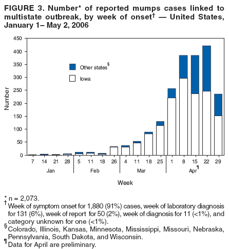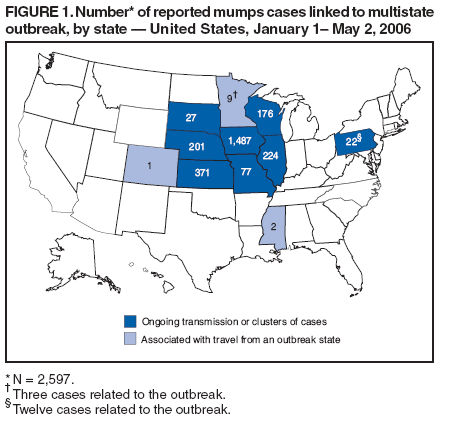 The current multistate mumps outbreak, with 2,597 cases reported through May 2, 2006, is the largest number of mumps cases reported to CDC in a single year since 1991, when 4,264 cases were reported (2). The first cases in the current outbreak were detected on a college campus in eastern Iowa in December 2005; the source of these initial cases is unknown (1). Although the age group most affected (38% of cases) has been young adults aged 18--24 years, many of whom are college students, the outbreak has spread to all age groups (1).