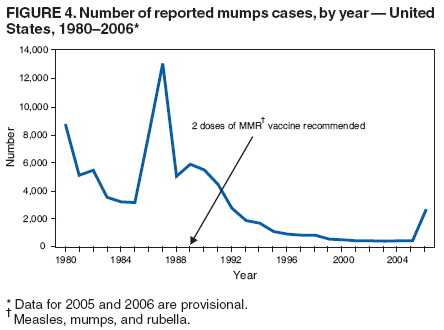 In the United States, the reported incidence of mumps declined after introduction of mumps vaccine in 1967 and the recommendation for its routine use in 1977 (3). After expanded recommendations for a 2-dose MMR vaccine schedule for measles control in 1989 (3), mumps cases declined further (Figure 4). During 2001--2003, fewer than 300 mumps cases were reported each year, a 99% decline from the 185,691 cases reported in 1968 (2).