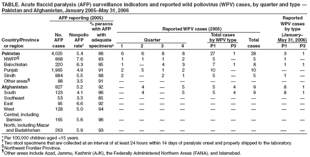 Persons using assistive technology might not be able to fully access information in this file. For assistance, please send e-mail to: mmwrq@cdc.gov. Type 508 Accommodation and the title of the report in the subject line of e-mail. Progress Toward Poliomyelitis Eradication --- Pakistan and Afghanistan, January 2005--May 2006As of March 2006, wild poliovirus (WPV) remained indigenous in four countries: Afghanistan, India, Nigeria, and Pakistan (1). Since 2005, WPV-endemic countries in Asia have intensified their polio eradication measures through use of type 1 monovalent oral polio vaccine (mOPV1)* and implementation of innovative social mobilization, communication, and vaccine-delivery strategies (2,3). This report describes polio eradication strategies in Afghanistan and Pakistan during January 2005--May 2006. Immunization ActivitiesRoutine vaccination coverage with oral polio vaccine (OPV) remains low in Afghanistan and in much of Pakistan (2). The most recent available estimates (2004) for national vaccination coverage of infants with 3 doses of OPV are 66% for Afghanistan and 65% for Pakistan (4). However, population figures for Afghanistan are uncertain, and coverage in both countries varies among provinces and districts. During 2005--2006, both countries continued to vaccinate children aged <5 years with additional OPV doses during large-scale, closely synchronized, house-to-house immunization campaigns, or supplementary immunization activities (SIAs). In 2005, Pakistan conducted eight SIAs (seven national immunization days [NIDs] and one subnational immunization day [SNID]), and Afghanistan conducted 10 SIAs (four NIDs, three SNIDs and three mop-up campaigns). In 2006, both countries conducted an SIA in January (NID in Pakistan and SNID in Afghanistan), March (NID in each country), and April (NID in each country), followed in early May by the first of two mop-up SIAs targeting the region stretching from central Pakistan into southern Afghanistan (Figure). A second SIA targeting the same area was held in early June 2006. Pakistan used mOPV1 in the September 2005 NID and in all subsequent rounds through April 2006. The extent of mOPV1 use varied by round but always included known areas of high risk in Northwest Frontier Province (NWFP) and Punjab and Sindh provinces. Because of WPV type 3 (WPV3) circulation in Balochistan, mOPV1 use in that province was delayed until the December 2005 SNID. In Afghanistan, mOPV1 was used in three rounds: in October 2005 in two provinces in the eastern region, during the April 2006 NID round in the southern region, and in the May 2006 mop-up in the southern, southeastern, and eastern regions. Both countries deployed additional partner staff members from areas at lower risk to areas at higher risk. Since January 2005, SIA staff members have targeted mobile groups (e.g., nomads, seasonal migrants and persons seeking temporary employment in harvesting, Afghan refugees moving between countries, and groups moving out of areas with ongoing military conflict) throughout the region with high virus transmission between central Pakistan and southern Afghanistan. Polio teams in both countries had difficulties gaining access to children and effectively implementing SIAs in several areas affected by conflict. In Pakistan, these areas included the North Waziristan, South Waziristan, and Bajaur agencies in the tribal area of NWFP, and, since mid-2005, two districts in eastern Balochistan (Dera Bugti and Kohlu). Worsening security had the greatest impact on the effectiveness of the vaccination campaign in the southern region of Afghanistan, despite strategies to overcome the problems (e.g., recruitment of additional local staff members). Acute Flaccid Paralysis (AFP) SurveillanceAFP reporting increased in both countries in 2005 compared with 2004; nonpolio AFP reporting rates were more than five cases per 100,000 population aged <15 years, and adequate stool specimens§ were collected from 89% and 92% of persons with AFP in Pakistan and Afghanistan, respectively. AFP surveillance remained above certification-standard levels¶ at the national level in both countries, provincial level in Pakistan, and regional level in Afghanistan. However, genetic analysis in 2005 and 2006 identified WPV chains of transmission in both countries that might have existed for 2--3 years without being detected by AFP surveillance. The primary gaps in surveillance are in southern Afghanistan. AFP surveillance in Pakistan and Afghanistan continues to receive laboratory support from the National Institutes of Health in Islamabad, Pakistan. In 2005, the laboratory isolated nonpolio enteroviruses from 19% and 22% of specimens from Pakistan and Afghanistan, respectively. Polio IncidenceIn Pakistan, 28 polio cases were confirmed with onset in 2005 (Table), compared with 53 cases in 2004. Twenty-seven of the 2005 cases were WPV1, and one was WPV3 (from Quetta district in the Balochistan province). For the first time, no high-season (August--October) transmission peak occurred; 13 cases were reported during this period in 2005. In 2006, as of May 31, four cases (three WPV1 and one WPV3) had been confirmed: one WPV1 case from Killa Abdullah in the Balochistan province (February 23 onset of paralysis); one WPV1 case from Dera Ismail Khan district in NWFP (February 23 onset of paralysis); one WPV1 case from Karachi in the Sindh province (April 28 onset of paralysis); and one WPV3 case from Jafarabad in the Balochistan province (May 15 onset of paralysis). In Afghanistan, nine polio cases with onset in 2005 were confirmed (five WPV1 and four WPV3), all from three provinces in the southern region: three WPV1 and two WPV3 cases from Helmand, two WPV3 cases from Oruzgan, and two WPV1 cases from Kandahar. In 2006, WPV1 transmission is continuing in the southern region. As of May 31, eight WPV1 cases had been reported, including seven from Kandahar (three from Spin Boldak district and four cases from distri