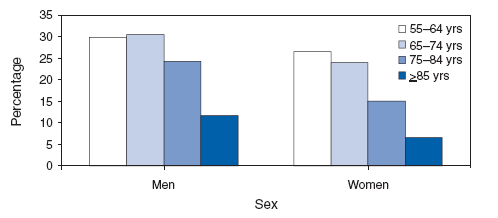 During 2000--2003, men aged >55 years were more likely than women in the same age group to engage in regular leisure-time physical activity. For both men and women, prevalence of regular activity was nearly the same for adults aged 55--64 and 65--74 years, declined among those aged 75--84 years, and declined further among those aged >85 years. Among adults aged >85 years, approximately one in 10 men and one in 20 women engaged in regular leisure-time physical activity. SOURCE: Schoenborn CA, Vickerie JL, Powell-Griner E. Health characteristics of adults 55 years and over: United States, 2000--2003. Advance data from vital and health statistics. No. 370. Hyattsville, MD: US Department of Health and Human Services, CDC, National Center for Health Statistics; 2006. Available at http://www.cdc.gov/nchs/data/ad/ad370.pd .