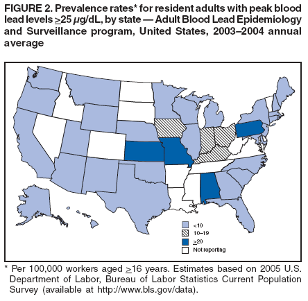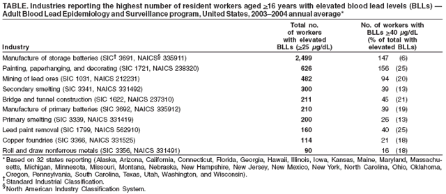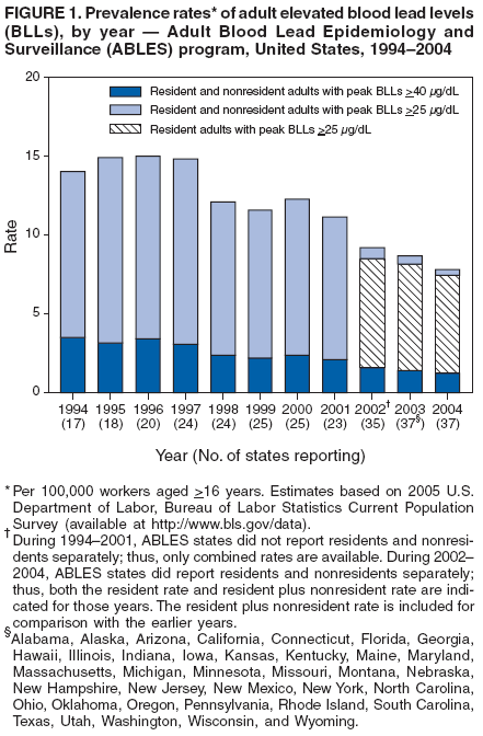 Persons using assistive technology might not be able to fully access information in this file. For assistance, please send e-mail to: mmwrq@cdc.gov. Type 508 Accommodation and the title of the report in the subject line of e-mail. Adult Blood Lead Epidemiology and Surveillance --- United States, 2003--2004Since 1994, CDC's state-based Adult Blood Lead Epidemiology and Surveillance (ABLES) program has been tracking laboratory-reported blood lead levels (BLLs) in U.S. adults. A national public health objective for 2010 (objective 20-7) is to reduce the prevalence of BLLs >25 µg/dL among employed adults to zero (1). A second key ABLES measurement level is a BLL >40 µg/dL, the level at which the Occupational Safety and Health Administration (OSHA) requires workers to have an annual medical evaluation of health effects related to lead exposure (2,3). A previously published ABLES report provided data collected from 35 states during 2002 (4). This report summarizes ABLES data collected from 37 states* during 2003--2004 and compares them with annual data collected since 1994. The findings indicated that the national rate of adults with elevated BLLs (i.e., >25 µg/dL) declined from 2002 to 2003 and declined further in 2004. Projections using 1994--2004 ABLES data trends indicate that the national prevalence rate of adults with BLLs >25 µg/dL will be approximately 5.7 per 100,000 employed adults in 2010. Increased prevention measures, particularly in work environments, will be necessary to achieve the 2010 objective of reducing this rate to zero. Changes in MethodsThis report reflects three changes in ABLES analytic methods. First, state rates for persons with elevated BLLs now focus on residents of the states reporting them; previously, state rates were for state residents and nonresidents combined. Second, the annual national prevalence rate was calculated using the combined number of persons with elevated BLLs from all 37 states divided by the combined employed populations of those states; previously, the average state rate was presented as the national rate. Third, the denominators used in state and national rate calculations were determined using updated Bureau of Labor Statistics estimates for employed populations aged >16 years in the reporting states during 1994--2004. National Magnitude and TrendDuring 2003 and 2004, totals of 9,884 and 9,170 resident adults, respectively, were reported with BLLs >25 µg/dL from 37 states. During 2002, a total of 9,915 resident adults had been reported with BLLs >25 µg/dL from 35 states. To compare yearly state rates, the numbers of resident adults with elevated BLLs from each state were divided by the state's annual resident employed population aged >16 years. The combined state numerators and denominators were then used to calculate the national prevalence rate. The national rate in 2003 for resident adults was 8.2 per 100,000 employed population aged >16 years and, in 2004, it declined to 7.5 per 100,000 (Figure 1). The rate in 2003 was 4% lower than in 2002 (8.5 per 100,000); the 2004 rate was 9% lower than in 2003. A total of 1,649 resident adults (1.4 per 100,000) with BLLs >40 µg/dL were reported in 2003, and 1,425 (1.2 per 100,000) were reported in 2004. This rate represents a 7% decrease from 2002 (1.5 per 100,000) to 2003 and a further decrease of 14% from 2003 to 2004. Occupational Sources of ExposureDuring 2003--2004, a total of 32§ of the 37 states reporting through ABLES provided North American Industry Classification System or Standard Industrial Classification (SIC) codes for 6,640 (67%) and 6,686 (73%) resident adults with BLLs >25 µg/dL, respectively, who were identified as exposed to lead via occupational sources. Ninety-four percent of adults with identified lead-exposure sources were exposed via occupational sources. During 2003--2004, the industry sectors with the highest annual average numbers of resident adults with elevated BLLs were manufacturing, 4,622 (69%); construction, 1,252 (19%); and mining, 488 (7%). The specific industries with the highest numbers were manufacture of storage batteries, 2,499; painting, paperhanging, and decorating, 626; and mining of lead ores, 482 (Table). Nonoccupational Sources of ExposureThe same 32 states that provided industry codes also provided sources for 442 and 400 resident adults with BLLs >25 µg/dL in 2003 and 2004, respectively, who were identified as exposed to lead via nonoccupational sources. During 2003--2004, nonoccupational sources represented 6% of the annual average of 7,084 resident adults with BLLs >25 µg/dL and identified sources of exposure. Among those exposed to nonoccupational sources, an annual average of 23% were exposed from shooting firearms, 13% from remodeling or renovation activities, 11% from hobbies (e.g., casting, ceramics, or stained glass), 5% from retained bullets or gunshot wounds, and 3% from pica (i.e., an abnormal craving or appetite for nonfood substances such as dirt, paint, or clay), ingesting lead-contaminated food or liquids, or ingesting traditional or folk medicines; another 3% were retired (and probably were former lead workers), and 36% were determined to have nonoccupational exposure from unknown sources. Distribution by StateFor resident adults with BLLs >25 µg/dL, 29 of 37 states reported average prevalence rates of <10 per 100,000 employed population aged >16 years during 2003--2004 (Figure 2). Rates ranged from 0.4 per 100,000 in Hawaii to 36.6 in Kansas. Twenty-six of the 35 states that reported BLLs both in 2002 and during 2003--2004 reported the same or lower rates during 2003--2004; nine reported higher rates. For resident adults with BLLs >40 µg/dL, 23 of 35 states reported the same or lower rates during 2003--2004; 12 reported higher rates. State rates ranged from zero cases per 100,000 in Alaska and Hawaii to 9.1 in Alabama. Reported by: RJ Roscoe, MS, JR Graydon, Div of Surveillance, Hazard Evaluations, and Field Studies, Nat