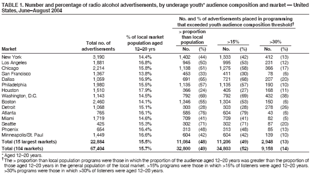 Persons using assistive technology might not be able to fully access information in this file. For assistance, please send e-mail to: mmwrq@cdc.gov. Type 508 Accommodation and the title of the report in the subject line of e-mail. Youth Exposure to Alcohol Advertising on Radio --- United States, June--August 2004Please note: An erratum has been published for this article. To view the erratum, please click here. In the United States, more underage youth drink alcohol than smoke tobacco or use illicit drugs (1). Excessive alcohol consumption leads to many adverse health and social consequences and results in approximately 4,500 deaths among underage youth each year (1,2). Recent studies have emphasized the contribution of alcohol marketing to underage drinking and have demonstrated that a substantial proportion of alcohol advertising appears in media for which the audience composition is youth-oriented (i.e., composed disproportionately of persons aged 12--20 years) (3,4). To determine the proportion of radio advertisements that occurred on radio programs with audiences composed disproportionately of underage youth and the proportion of total youth exposure to alcohol advertising that occurs as a result of such advertising, researchers at the Center on Alcohol Marketing and Youth (Health Policy Institute, Georgetown University, District of Columbia) evaluated the placement of individual radio advertisements for the most advertised U.S. alcohol brands and the composition of audiences in the largest 104 markets in the United States. This report summarizes the results of that study, which indicate that alcohol advertising is common on radio programs which have disproportionately large youth audiences and that this advertising accounts for a substantial proportion of all alcohol radio advertising heard by underage youth. These results further indicate that 1) the current voluntary standards limiting alcohol marketing to youth should be enforced and ultimately strengthened, and 2) ongoing monitoring of youth exposure to alcohol advertising should continue. In this study, underage youth were defined as persons aged 12--20 years. Age 12 years is the youngest age at which exposure to radio advertising is tracked, and age 21 years is the minimum legal drinking age in all U.S. states. Radio programs based on three levels of youth audience composition were assessed. The first level was based on a market-specific proportionate standard in which the proportion of the audience aged 12--20 years exceeded its proportion in the general population of a given local market. The second level was based on a standard in which the proportion of youth aged 12--20 years exceeded 15% of the audience; this corresponds to the proportion of the U.S. population aged >12 years who are aged 12--20 years. This is also the threshold above which the National Research Council and Institute of Medicine (NRC/IOM) recommends that alcohol companies refrain from advertising. The third level was based on a standard in which the proportion of youth aged 12--20 years exceeded 30% of the audience; this threshold represents the level above which major alcohol companies have agreed not to advertise on radio and other media. Overall, 238 unique radio advertisements for the 25 most advertised alcohol brands were catalogued by Video Monitoring Service (New York, New York). Nonproduct advertisements (e.g., advertisements promoting responsible drinking) were excluded from the analysis. Data on the frequency with which these advertisements appeared on individual radio programs in the top 104 media markets in the United States, which account for approximately 50% of the U.S. population (5), were obtained from Broadcast Verification Services (New York, New York). Advertising occurrences were identified for 24 of the 25 leading brands. To assess variability in advertising by metropolitan area, a subset of the advertisements in the sample from the 15 largest U.S. radio markets, which account for approximately one third of the U.S. population (5), were analyzed. Monitoring took place during June 15--August 5, 2004. This period was selected because this period typically has the highest spending for alcohol advertising (6), and 2004 was the most recent year for which data on advertising placement were available. Data on listener characteristics (e.g., audience composition by age, race/ethnicity, and sex) for the summer of 2003, the most recent comparable rating period for which data were available, were obtained from Arbitron Ratings (New York, New York). Advertisements that aired between midnight and 6:00 a.m., which accounted for 3% of all alcohol advertising placements, were excluded because Arbitron does not collect audience data for these hours. Of the 67,404 alcohol advertisements assessed in the sample from all 104 markets, 32,800 (49%) were placed on programming for which the local audience was composed disproportionately of underage youth (i.e., the market-specific proportionate standard) (Table 1). In the 15 largest radio markets, 11,084 (48%) of 22,884 alcohol advertisements were placed on programming with disproportionately large youth audiences, ranging from 24% in Houston to 76% in Atlanta (Table 1). Results based on a 15% threshold were similar to those based on the market-specific proportionate standard. For example, 52% of alcohol advertisements in all 104 markets and 49% of advertisements in the 15 largest markets aired on radio programs for which the youth audience composition was >15%. Of all advertisements in the 104 markets, 9,158 (14%) aired on programs for which youth represented >30% of listeners (Table 1). In 13 markets, approximately one half of advertisements were in programs that exceeded the 30% standard, whereas in 13 other markets, no advertising placements exceeded the 30% threshold. In the 15 largest radio markets, 2,948 (13%) of the advertisements aired on programs in which >30% of the audience was aged 12--20 year