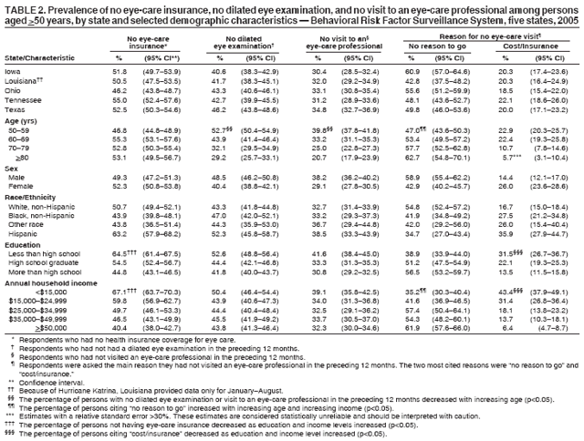 Persons using assistive technology might not be able to fully access information in this file. For assistance, please send e-mail to: mmwrq@cdc.gov. Type 508 Accommodation and the title of the report in the subject line of e-mail. Visual Impairment and Eye Care Among Older Adults --- Five States, 2005Blindness and visual impairment are among the 10 most common causes of disability in the United States (1) and are associated with shorter life expectancy and lower quality of life (2,3). Previously, state-specific prevalences of visual impairment and eye disease were estimated from national prevalences. However, in 2005, five states (Iowa, Louisiana, Ohio, Tennessee, and Texas) provided state-specific estimates by using the new CDC Behavioral Risk Factor Surveillance System (BRFSS) vision module. CDC analyzed data from the module to determine the self-reported prevalence of visual impairment, eye disease, eye injury, and lack of eye-care insurance and eye examination among persons aged >50 years in each of these five states and among certain sociodemographic populations overall. This report describes the results of that analysis, which indicated variation in disease prevalence and use of eye care among individual states and also among racial/ethnic populations and age groups within the five states combined. The variability among state data suggests that state-specific surveillance of visual impairment and eye care and investigation by states to identify influencing factors might lead to creation of vision programs better suited to individual state needs. BRFSS is a state-based, random-digit--dialed telephone survey of the noninstitutionalized, U.S. civilian population aged >18 years. The median Council of American Survey Research Organizations response rate for BRFSS in 2005 was 51.1%, with a range among states of 34.6% to 67.4%. Response rates for the five states using the optional BRFSS vision module in 2005 were as follows: Iowa, 60.2%; Louisiana, 51.4%; Ohio, 49.5%; Tennessee, 59.6%; and Texas, 45.2%. Among the five states, Louisiana provided data only for January--August because of Hurricane Katrina. Respondents were classified as having visual impairment if they answered "a little difficulty," "moderate difficulty," "extreme difficulty," or "unable to do because of eyesight" to the question, "How much difficulty, if any, do you have in recognizing a friend across the street?" or to the question, "How much difficulty, if any, do you have watching television?"* Three selected eye diseases (i.e., cataract, glaucoma, and macular degeneration) and workplace eye injury were identified if respondents answered "yes" to the relevant questions. Diabetic retinopathy was identified (from the BRFSS diabetes module) if respondents with diabetes answered "yes" to the question, "Has a doctor ever told you that diabetes has affected your eyes or that you had retinopathy?" The BRFSS vision module also incorporated questions relating to use of eye care. Respondents were classified as not having eye insurance if they answered "no" to the question, "Do you have any kind of health insurance coverage for eye care?" Respondents were classified as not having had a dilated eye examination in the preceding 12 months if they answered other than "within the past month" or "within the past year (1--12 months ago)" to the question, "When was the last time you had an eye exam in which the pupils were dilated?" They were classified as not having visited an eye-care professional in the preceding 12 months if they answered other than "within the past month" or "within the past year" to the question, "When was the last time you visited any eye-care professional?" In addition, respondents were asked the main reason they had not visited an eye-care professional in the preceding 12 months. The analyses were weighted to make estimates representative of the civilian, noninstitutionalized population in the five states. A total of 13,931 responses§ were analyzed using statistical software to account for the survey design complexity. Trends were assessed using linear regression by the weighted least squares method. The self-reported prevalence of visual impairment and eye disease among persons aged >50 years varied among the five states that used the BRFSS vision module in 2005. The prevalence of visual impairment ranged from 14.3% (95% confidence interval [CI] = 12.9%--15.8%) in Iowa to 20.5% (CI = 18.6%--22.5%) in Ohio (Table 1). Prevalence of cataract ranged from 29.0% (Texas) to 34.3% (Iowa), prevalence of glaucoma ranged from 5.0% (Tennessee) to 7.4% (Louisiana), prevalence of macular degeneration ranged from 3.1% (Tennessee) to 5.4% (Iowa), and prevalence of diabetic retinopathy ranged from 2.7% (Ohio) to 4.3% (Louisiana). The self-reported prevalence of workplace eye injury history ranged from 5.8% (Tennessee) to 9.0% (Iowa) among the five states. With the exception of diabetic retinopathy, women had higher prevalence of visual impairment and eye disease than men. Among age groups, prevalence of cataract and glaucoma increased with age, and prevalence of workplace eye injury history decreased with age (p<0.05). Having eye-care insurance and use of eye care also varied among the five states (Table 2). The percentage of participants reporting no eye-care insurance ranged from 46.2% (Ohio) to 55.0% (Tennessee). In addition, the percentage reporting they had not had a dilated eye examination during the preceding 12 months ranged from 40.6% (Iowa) to 46.2% (Texas); the percentage reporting no visit to an eye-care professional in the preceding 12 months ranged from 30.4% (Iowa) to 34.8% (Texas). Persons in the five states cited "no reason to go" (range: 42.8% in Louisiana to 60.9% in Iowa) and "cost/insurance" (range: 18.5% in Ohio to 22.1% in Tennessee) as the most common reasons for not having visited an eye-care professional in the preceding 12 months. Overall, persons aged 50--59 years were least likely to report not havi