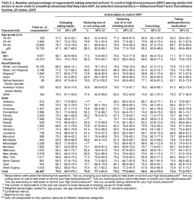 Persons using assistive technology might not be able to fully access information in this file. For assistance, please send e-mail to: mmwrq@cdc.gov. Type 508 Accommodation and the title of the report in the subject line of e-mail. Prevalence of Actions to Control High Blood Pressure --- 20 States, 2005High blood pressure (HBP) increases the risk for heart disease and stroke, the first and third leading causes of death in the United States, respectively (1). The association between HBP and cardiovascular disease is independent of other risk factors (2). Nearly 30% of the U.S. adult population had HBP* during 2001--2004, according to the National Health and Nutrition Examination Survey (NHANES), and the prevalence has increased compared with 1988--1994 NHANES data (3,4). Although HBP is easily detectable and can be controlled with treatment, the condition is not controlled (i.e., systolic blood pressure <140 mm Hg and diastolic pressure <90 mm Hg) in approximately 70% of persons (3). A Healthy People 2010 objective (objective 12-11) is to increase the proportion of adults with HBP who are taking action to help control their blood pressure (5). To assess the prevalence of self-reported HBP and actions to control HBP, CDC analyzed 2005 data from an optional module in the Behavioral Risk Factor Surveillance System (BRFSS) in the 20 states that participated. The results indicated that although nearly all adults with HBP in the 20 states were taking some action to control their blood pressure, some persons can take additional actions to control their HBP, if indicated, including dietary changes, exercise, and taking prescribed medication. BRFSS is a state-based, random-digit--dialed telephone survey of the U.S. civilian, noninstitutionalized population aged >18 years. The survey is administered in all 50 states, the District of Columbia (DC), and three U.S. territories (Guam, Puerto Rico, and the U.S. Virgin Islands). During 2005, a total of 24,447 of 101,574 respondents in 20 states responded "yes" to the following question: "Were you told on two or more different visits to a doctor or other health professional that you had high blood pressure?" Women who reported HBP only during pregnancy were not categorized as having HBP. Respondents also were asked the following five questions about actions they were currently taking to control their HBP: "Are you changing your eating habits to help lower or control your high blood pressure?" "Are you cutting down on salt to help lower or control your high blood pressure?" "Are you reducing alcohol use to help lower or control your high blood pressure?" "Are you exercising to help lower or control your high blood pressure?" "Are you currently taking medicine for your high blood pressure?" The median response rate for the 20 states was 51.0% (range: 34.6%--66.7%). Data were weighted to 2005 state population estimates. Prevalence estimates and 95% confidence intervals were calculated. The age-adjusted prevalence of self-reported HBP was 19.4% (Table 1) for the 20 states combined. Self-reported HBP increased by age group, and the age-adjusted prevalence was highest among non-Hispanic blacks (27.2%). Among the 20 states, self-reported HBP tended to be highest in southern states, with Mississippi (25.5%), West Virginia (23.5%), Alabama (23.2%), Louisiana (22.1%), and Arkansas (21.9%) having the highest age-adjusted prevalence. Approximately 98.1% of adults with self-reported HBP reported taking at least one action to lower or control their blood pressure, and a majority of respondents reported taking each of the five actions: 70.9% changed their eating habits, 79.5% decreased use of salt or did not use salt, 79.2% reduced consumption of alcohol or did not drink alcohol, 68.6% exercised, and 73.4% took antihypertensive medication (Table 2). Women were more likely than men to report changing eating habits and reducing consumption of alcohol or not drinking alcohol. Reducing use of salt or not using salt and taking antihypertensive medicine increased with age. A higher proportion of non-Hispanic blacks (90.0%) compared with other racial/ethnic groups reported reducing use of salt or not using salt. The proportion of respondents with self-reported HBP who took each action varied by state. The percentage of adults who reported changing eating habits ranged from 59.7% (Montana) to 80.5% (Mississippi); the percentage who reduced use of salt or did not use salt ranged from 69.5% (Minnesota) to 83.8% (Hawaii); the percentage who reduced alcohol consumption or did not drink alcohol ranged from 61.4% (Minnesota) to 88.3% (Alabama); the percentage who exercised ranged from 57.6% (West Virginia) to 79.9% (Kansas); and the percentage who took antihypertensive medication ranged from 58.1% (Montana) to 85.8% (Louisiana). Reported by: CH Denny, PhD, KJ Greenlund, PhD, C Ayala, PhD, NL Keenan, PhD, JB Croft, PhD, Div for Heart Disease and Stroke Prevention, National Center for Chronic Disease Prevention and Health Promotion, CDC. Editorial Note:Controlling HBP can reduce disability and death from heart disease, stroke, and other cardiovascular diseases. Recommendations to control HBP include both lifestyle changes and antihypertensive medication (2). The findings in this report indicate that, although nearly all adults with self-reported HBP take at least some health action to control their HBP, some persons can take additional actions if indicated. For example, although nearly 70% of respondents report exercising to control their HBP, 30% do not exercise to control HBP. The findings in this report are subject to at least four limitations. First, data were based on self-reports and therefore were subject to recall bias and social desirability bias (i.e., providing a socially acceptable answer rather than the most accurate answer). Second, the degree and effects from the actions taken to reduce HBP were not assessed; for example, although exercising to control HBP was assessed, t