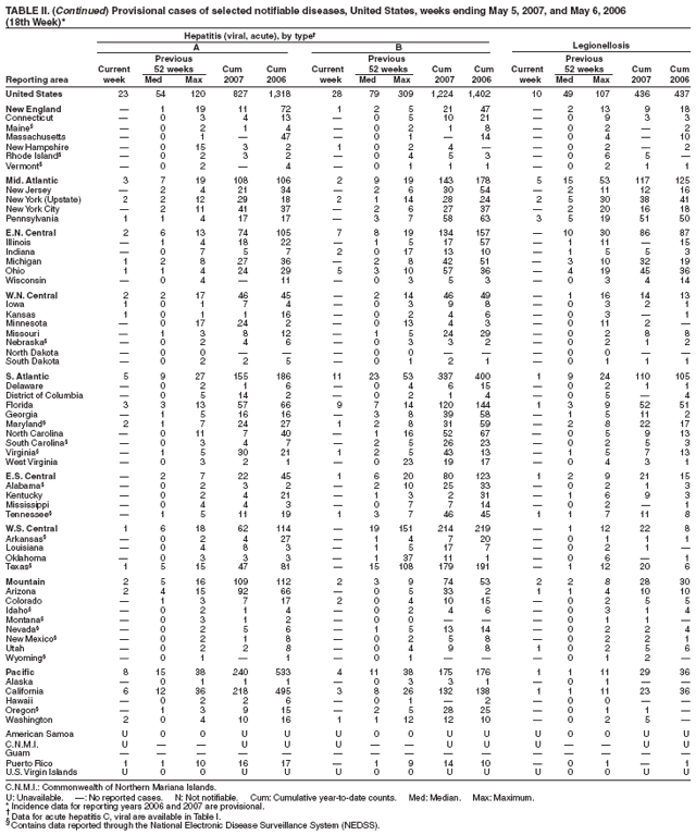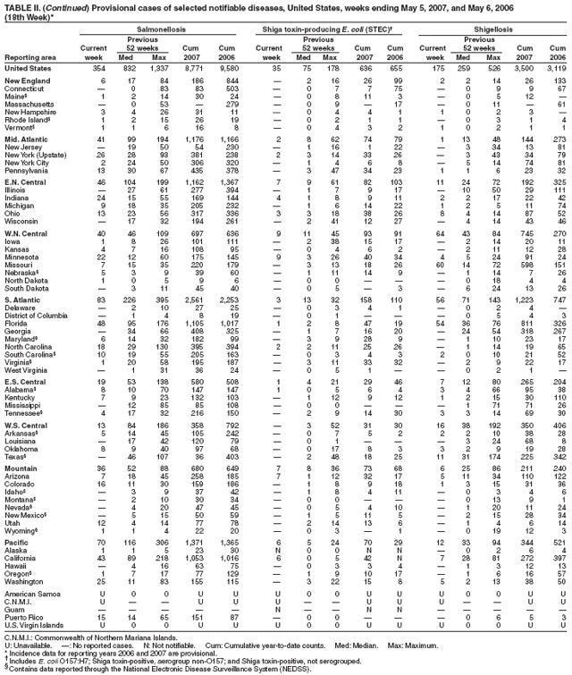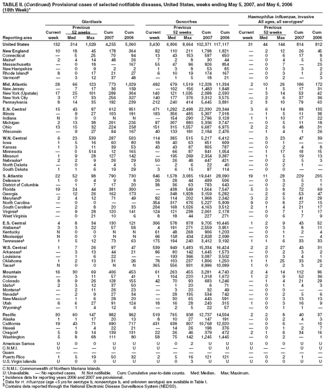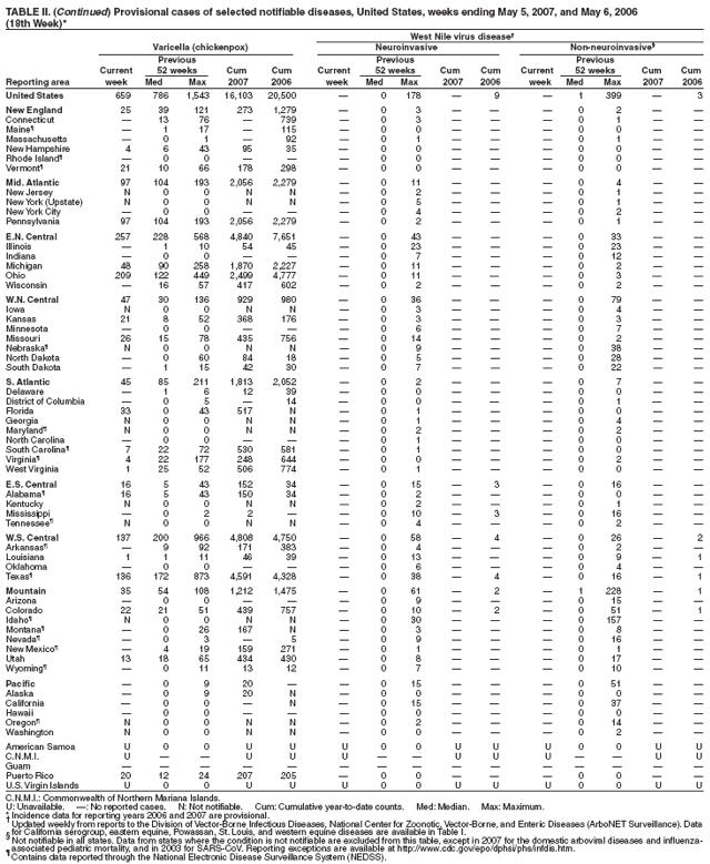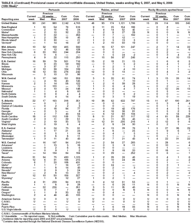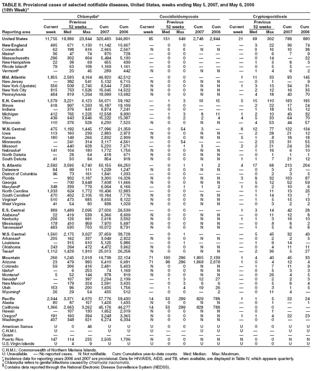 Table II   Provisional cases of selected notifiable diseases, United States, weeks ending May 5, 2007 and May 6, 2006 (18th Week)
