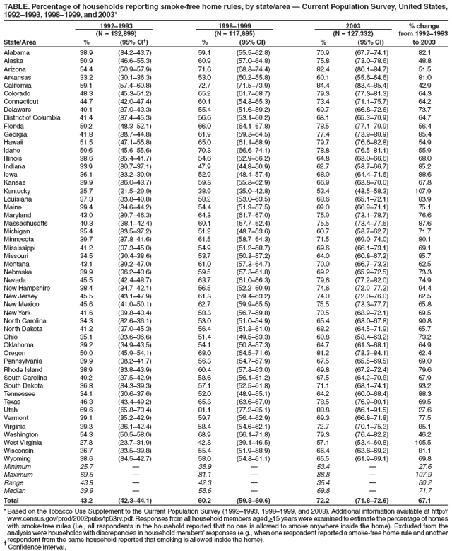 Persons using assistive technology might not be able to fully access information in this file. For assistance, please send e-mail to: mmwrq@cdc.gov. Type 508 Accommodation and the title of the report in the subject line of e-mail. State-Specific Prevalence of Smoke-Free Home Rules --- United States, 1992--2003Secondhand smoke (SHS) causes premature death and disease in children and nonsmoking adults (1). The home is the primary source of exposure to SHS for infants and children and a major source of SHS exposure for nonsmoking adults (1). To assess trends in national and state-specific prevalence of home "no smoking" rules (i.e., smoke-free home rules), CDC analyzed data from the Tobacco Use Supplement to the Current Population Survey for 1992--1993, 1998--1999, and 2003. This report summarizes the results of that analysis, which indicated that the national prevalence of households with smoke-free home rules in the United States increased significantly, from 43.2% during 1992--1993 to 72.2% in 2003. During this period, the national prevalence of such rules increased from 9.6% to 31.8% among households with at least one smoker and from 56.8% to 83.5% among households with no smoker. A regression analysis of the rate of change over time indicated that the increase in smoke-free homes during this period was not significantly different for households with at least one smoker compared with households with no smoker. Statistically significant increases in the prevalence of smoke-free home rules were also observed in all states, although variation was observed among states. Comprehensive tobacco-control measures, including 1) evidence-based interventions to help smokers quit, 2) policies making workplaces and public places smoke-free, 3) voluntary rules making homes smoke-free, and 4) initiatives to educate the public regarding the health effects of SHS, are needed to further reduce exposure of nonsmokers to SHS. The Current Population Survey (CPS) is a continuous monthly household survey administered by the U.S. Census Bureau for the Bureau of Labor Statistics that examines labor-force indicators for the U.S. civilian, noninstitutionalized population aged >15 years (2). Since 1992--1993, the National Cancer Institute has sponsored a Tobacco Use Supplement (TUS) to this survey with questions on tobacco use and related topics, including voluntary home smoking rules. CDC has cosponsored the supplement since 2001. The TUS-CPS was conducted in selected months during 1992--1993, 1995--1996, 1998--1999, 2000, 2001--2002, and 2003. Approximately 75% of respondents were contacted by telephone, and 25% of respondents were contacted by personal home visit. The supplement self-response rates for the TUS-CPS ranged from 65% in 2003 to 72% during 1992--1993 (2).* Data were adjusted for nonresponse and weighted using the household supplement self-response weight. This weight was calculated by summing the self-response weights for all respondents aged >15 years and dividing by the rostered number of persons aged >15 years to provide national and state prevalences of smoke-free home rules. Each household member aged >15 years was asked, "Which statement best describes the rules about smoking inside your home?" The response options were 1) "No one is allowed to smoke anywhere inside your home," 2) "Smoking is allowed in some places or at some times inside your home," or 3) "Smoking is permitted anywhere inside your home." Excluded from the analysis were households with discrepancies in household members' responses (e.g., when one respondent reported a smoke-free home rule and another respondent from the same household reported that smoking is allowed inside the home). From 1992--1993 to 2003, increases occurred nationally and in every state in the percentage of households with complete smoke-free home rules (i.e., no one is allowed to smoke anywhere inside the home) (Table). During 1992--1993, the percentage of households with smoke-free home rules ranged from 25.7% in Kentucky to 69.6% in Utah. In 2003, the percentage ranged from 53.4% in Kentucky to 88.8% in Utah. The state with the smallest increase during this period was Utah, which had the highest prevalence of smoke-free home rules during 1992--1993. Kentucky, the state with the lowest prevalence of smoke-free home rules during 1992--1993, had the largest increase during this period. Reported by: A Trosclair, MS, S Babb, MPH, R Murphy-Hoefer, PhD, K Asman, MSPH, C Husten, MD, A Malarcher, PhD, Office on Smoking and Health, National Center for Chronic Disease Prevention and Health Promotion, CDC. Editorial Note:Revised Healthy People 2010 objectives call for reducing the proportion of children aged <6 years who are exposed regularly (>4 days per week) to SHS in the home to 6% (objective 27-9) and reducing to 63% the proportion of nonsmokers aged >4 years who are exposed to SHS, as measured by having detectable levels of cotinine (a metabolite of nicotine used as a biologic marker for SHS exposure in nonsmokers) in their blood (objective 27-10) (3). The second objective has already been met: approximately 47% of U.S. nonsmokers were exposed to SHS during 1999--2002; in addition, the prevalence of regular exposure of children aged <6 years to SHS in the home has declined, from 27% in 1994 to 8% in 2005. The progress made toward realizing these objectives reflects recent decreases in SHS exposure in workplaces, public places, homes, and other settings. The recently published Surgeon General's report The Health Consequences of Involuntary Exposure to Tobacco Smoke notes that SHS exposure declined during the past decade as a result of the implementation of smoke-free policies in workplaces and public places (1). However, approximately 126 million children and nonsmoking adults were still exposed to SHS in the United States as of 1999--2002. Because children spend so much time in the home, it remains the primary setting where they are exposed to SHS (1). Adults 