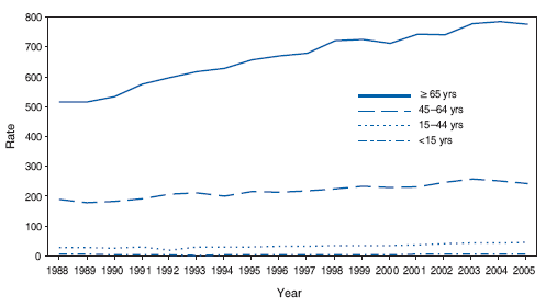 The rate of diabetes among patients aged >65 years who were discharged from hospitals was significantly higher than that for any other age group and increased approximately 50% during 1988--2005. The rate increased approximately 56% for patients aged 15--44 years and 29% for those aged 45--64 years during this period. The rate for patients aged <15 years did not change. SOURCE: National Hospital Discharge Survey. Annual files, 1988--2005. Available at http://www.cdc.gov/nchs/about/major/hdasd/nhds.htm.