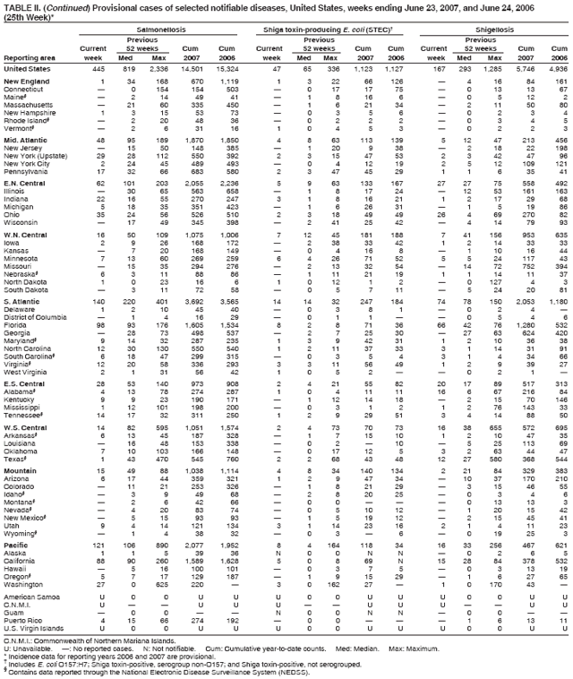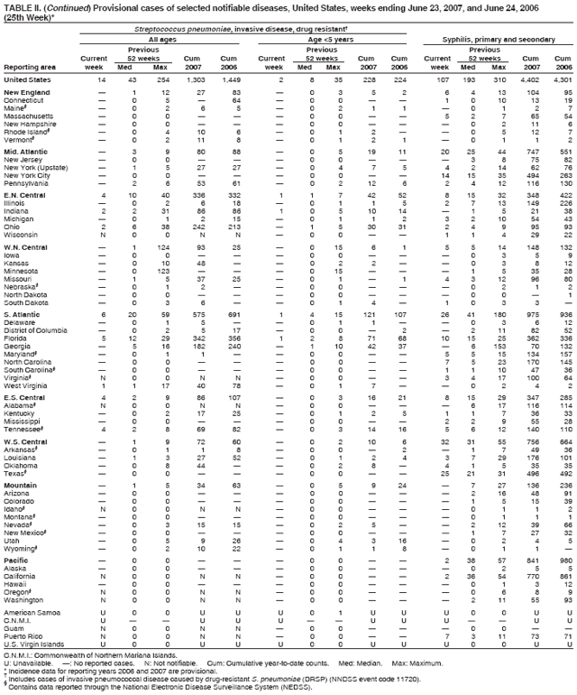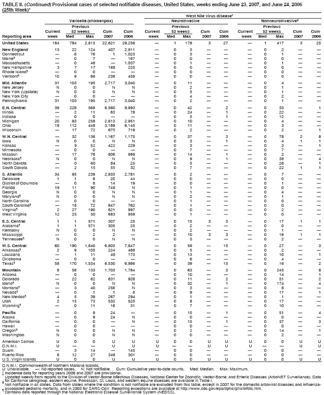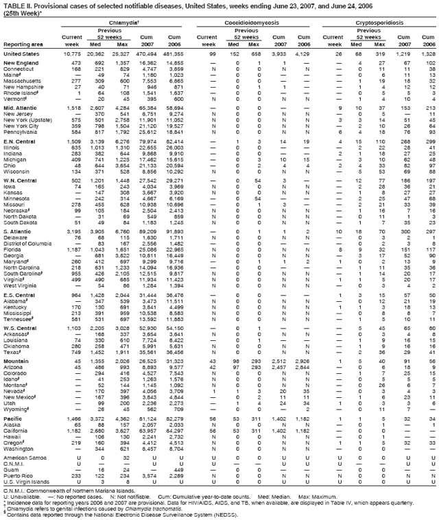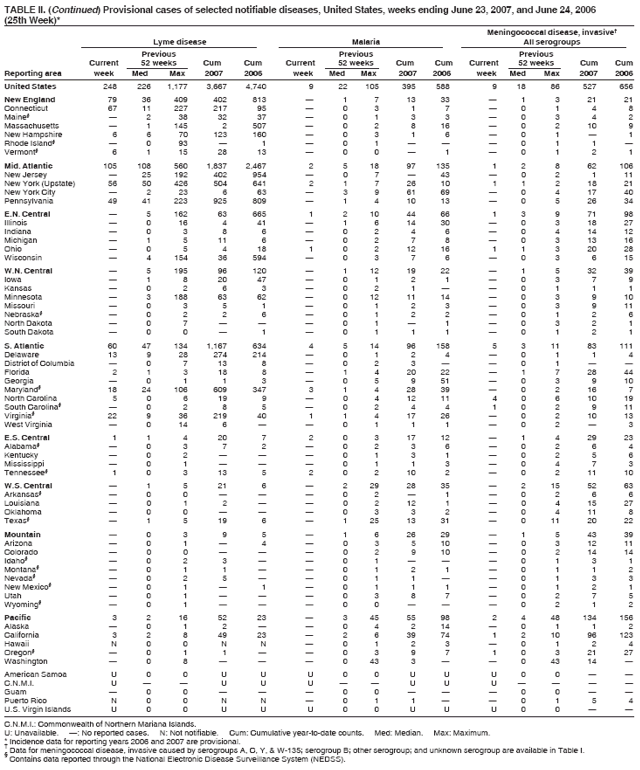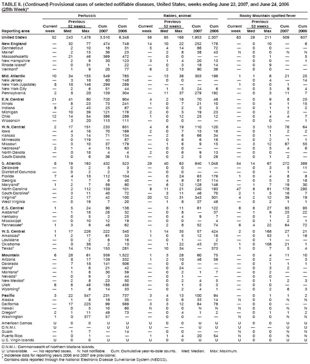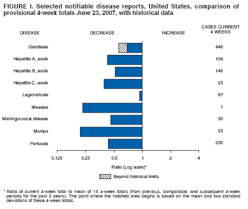 Persons using assistive technology might not be able to fully access information in this file. For assistance, please send e-mail to: mmwrq@cdc.gov. Type 508 Accommodation and the title of the report in the subject line of e-mail. Notifiable Diseases/Deaths in Selected Cities Weekly InformationFigure I Selected notifiable disease reports, United States, comparison of provisional 4-week totals ending June 23, 2007, with historical data Table I Summary of provisional cases of selected notifiable diseases, United States, cumulative, week ending June 23, 2007 (25th Week) Table II Provisional cases of selected notifiable diseases, United States, weeks ending June 23, 2007 and June 24, 2006 (25th Week) Table III Deaths in 122 U.S. cities, week ending June 23, 2007 (25th Week) Figure I ![]() Return to top. Table I ![]() Return to top. Table II