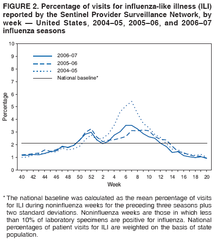 Persons using assistive technology might not be able to fully access information in this file. For assistance, please send e-mail to: mmwrq@cdc.gov. Type 508 Accommodation and the title of the report in the subject line of e-mail. Update: Influenza Activity --- United States and Worldwide, 2006--07 Season, and Composition of the 2007--08 Influenza VaccineDuring the 2006--07 season, influenza activity peaked in mid-February in the United States and was associated with less mortality and lower rates of pediatric hospitalizations than during the previous three seasons. In the United States, influenza A (H1) viruses predominated overall, but influenza A (H3) viruses were isolated more frequently than influenza A (H1) viruses late in the season. Although influenza A (H1), A (H3), and B viruses cocirculated worldwide, influenza A (H3) viruses were the most commonly reported type in Europe and Asia. Sporadic cases of avian influenza A (H5N1) virus infections associated with severe illness or death were reported among humans in Cambodia, China, Egypt, Indonesia, Laos, Nigeria, and Viet Nam. This report summarizes influenza activity in the United States and worldwide during the 2006--07 influenza season (October 1, 2006--May 19, 2007) and describes the composition of the 2007--08 influenza vaccine. United StatesThe national percentage of respiratory specimens testing positive for influenza and the proportion of outpatient visits to sentinel providers for influenza-like illness (ILI)* peaked in mid-February. Although influenza A (H1) viruses were most commonly isolated overall, influenza A (H3) viruses were more frequently identified than influenza A (H1) viruses from early March through May. A small number of influenza B viruses also were identified. Viral SurveillanceDuring October 1, 2006--May 19, 2007, World Health Organization (WHO) and National Respiratory and Enteric Virus Surveillance System (NREVSS) collaborating laboratories in the United States tested 179,268 respiratory specimens for influenza viruses; 23,753 (13.2%) were positive (Figure 1). Of these, 18,817 (79.2%) were influenza A viruses and 4,936 (20.8%) were influenza B viruses. Among the influenza A viruses, 6,280 (33.4%) were subtyped; 3,912 (62.3%) were influenza A (H1) viruses and 2,368 (37.7%) were influenza A (H3) viruses. The proportion of specimens testing positive for influenza first exceeded 10% during the week ending December 23, 2006 (week 51), peaked at 28.0% during the week ending February 10, 2007 (week 6), and declined to less than 10% during the week ending April 28, 2007 (week 17). The proportion was above 10% positive for 14 consecutive weeks. The peak percentage of specimens testing positive for influenza during the previous three seasons ranged from 22.6% to 34.7%, and the peak occurred during early December to early March (1; CDC, unpublished data, 2007). During the previous three influenza seasons, the number of consecutive weeks during which more than 10% of specimens tested positive for influenza ranged from 13 to 17 weeks (1; CDC, unpublished data, 2007). Composition of the Influenza Vaccine for the 2007--08 SeasonThe Food and Drug Administration's Vaccines and Related Biological Products Advisory Committee recommended that the 2007--08 trivalent influenza vaccine for the United States contain A/Solomon Islands/3/2006-like (H1N1), A/Wisconsin/67/2005-like (H3N2), and B/Malaysia/2506/2004-like viruses. This represents a change only in the influenza A (H1N1) component. A/Solomon Islands/3/2006 is a recent antigenic variant of the 2006--07 vaccine strain A/New Caledonia/20/99. The influenza A (H3N2) and influenza B components remain the same. These recommendations were based on antigenic analyses of recently isolated influenza viruses, epidemiologic data, postvaccination serologic studies in humans, and the availability of candidate vaccine strains and reagents. Antigenic CharacterizationSince October 1, 2006, CDC has antigenically characterized 1,107 influenza viruses collected by U.S. laboratories: 486 influenza A (H1) viruses, 289 influenza A (H3) viruses, and 332 influenza B viruses. Of the 486 influenza A (H1) viruses, 439 (90%) were characterized as similar to A/New Caledonia/20/99, the influenza A (H1N1) component recommended for the 2006--07 influenza vaccine. Forty-five (9%) viruses showed reduced titers with antisera produced against A/New Caledonia/20/99 and are similar to A/Solomon Islands/3/2006, which is a recent antigenic variant of A/New Caledonia/20/99 and is the influenza A (H1N1) component recommended for the 2007--08 influenza vaccine. Two influenza A (H1) viruses showed reduced titers with antisera produced against both A/New Caledonia/20/99 and A/Solomon Islands/3/2006. Of the 289 influenza A (H3) viruses, 69 (24%) were characterized as similar to A/Wisconsin/67/2005, the H3N2 component recommended for the 2007--08 vaccine, and 220 (76%) of the 289 viruses showed reduced titers with antisera produced against A/Wisconsin/67/2005. Influenza B viruses currently circulating can be divided into two antigenically distinct lineages represented by B/Yamagata/16/88 and B/Victoria/02/87 viruses. A total of 254 (77%) of the 332 influenza B viruses that have been characterized belong to the B/Victoria lineage: 128 (50%) were similar to B/Ohio/01/2005, and 126 (50%) showed reduced titers with antisera produced against B/Ohio/01/2005. B/Ohio/01/2005 is antigenically equivalent to B/Malaysia/2506/2004, the recommended influenza B component for the 2007--08 influenza vaccine. Seventy-eight (23%) of the 332 influenza B viruses were identified as belonging to the B/Yamagata lineage. Influenza-Like Illness (ILI) SurveillanceThe weekly percentage of patient visits to U.S. sentinel providers for ILI exceeded or was at baseline levels (2.1%) during the weeks ending December 16, 2006--March 24, 2007 (weeks 50--12) and peaked twice, once at 3.0% for the week ending December 30, 2006 (week 52), and again at 3.