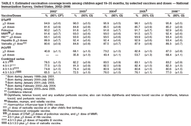 Persons using assistive technology might not be able to fully access information in this file. For assistance, please send e-mail to: mmwrq@cdc.gov. Type 508 Accommodation and the title of the report in the subject line of e-mail. National, State, and Local Area Vaccination Coverage Among Children Aged 19--35 Months --- United States, 2006Please note: An erratum has been published for this article. To view the erratum, please click here. The National Immunization Survey (NIS) provides vaccination coverage estimates among children aged 19--35 months for each of the 50 states and selected urban and county areas.* This report describes the findings of the 2006 NIS, which indicated increases in national coverage with pneumococcal conjugate vaccine (PCV) and varicella vaccine (VAR) and a stable coverage level for the 4:3:1:3:3:1 vaccine series (i.e., >4 doses of diphtheria, tetanus toxoid, and any acellular pertussis vaccine [DTaP]; >3 doses of poliovirus vaccine; >1 dose of measles, mumps, and rubella vaccine [MMR]; >3 doses of Haemophilus influenzae type b [Hib] vaccine; >3 doses of hepatitis B vaccine [HepB]; and >1 dose of VAR). However, national coverage estimates remained below the Healthy People 2010 target of 90% coverage for PCV, DTaP, and VAR and below the 80% target for the 4:3:1:3:3:1 vaccine series (1). No significant racial/ethnic disparities in 4:3:1:3:3:1 series coverage were observed after controlling for family income. State and local immunization programs should continue to identify and target children who are not fully vaccinated, especially because of low socioeconomic status and other barriers. To estimate coverage for all age-eligible children, NIS uses a quarterly, random-digit--dialed sample of telephone numbers for each survey area. NIS methodology, including the weighting of respondents to represent the population of children aged 19--35 months, has been described previously (2). During 2006, the household response rate (3) was 64.5%; a total of 21,044 children with provider-reported vaccination records were included in this report, representing 70.4% of all children with completed household interviews. Statistical analyses were conducted using t tests and logistic regression modeling. All tests with p<0.05 were regarded as statistically significant. An income-to-poverty ratio variable§ was added to logistic regression models to control for racial/ethnic differences in family income, which was calculated using total household income, family size, and household composition and adjusted for annual cost of living using federal poverty guidelines (4). Estimated national 4:3:1:3:3:1 vaccine series coverage did not change significantly from 2005 (76.1%) to 2006 (77.0%). In 2006, significant increases from 2005 levels were observed for PCV, VAR, and poliovirus vaccine (Table 1). The largest increases were observed for PCV; coverage increased from 82.8% to 87.0% for >3 doses of PCV and from 53.7% to 68.4% for >4 doses. As in previous years, substantial differences were observed in vaccination coverage among states and local areas (5) for the 4:3:1:3:3:1 vaccine series and individual vaccines. Estimated coverage with the 4:3:1:3:3:1 vaccine series ranged from 83.6% in Massachusetts to 59.5% in Nevada (Table 2). Among local areas, 4:3:1:3:3:1 series coverage ranged from 81.4% in Boston, Massachusetts, to 65.2% in Detroit, Michigan. For vaccines with national coverage estimates below the 90% Healthy People 2010 target (PCV, DTaP, and VAR), PCV (>3 doses) coverage ranged from 96.6% in Rhode Island to 69.9% in South Dakota, DTaP (>4 doses) coverage ranged from 92.6% in Massachusetts to 73.9% in Nevada, and VAR coverage ranged from 96.4% in Rhode Island to 75.7% in Wyoming (Table 2). MMR coverage by state ranged from 97.5% in North Carolina to 84.9% in Nevada (Table 2). In 2006, vaccination coverage for the 4:3:1:3:3:1 vaccine series was 77.9% for white¶ children, 77.4% for Hispanic children, 75.9% for Asian children, 74.4% for American Indian/Alaska Native children, and 73.9% for black children (Table 3). Series coverage was significantly lower overall for black children compared with white children. Among black children, coverage ranged from 71.9% (95% confidence interval [CI] = +4.8) among those living below the poverty level to 76.7% (CI = +3.1) among those living at or above the poverty level; among white children, coverage ranged from 69.5% (CI = +4.4) among those living below the poverty level to 78.9% (CI = +1.3) among children living at or above the poverty level. A logistic regression model that controlled for differences in income across racial/ethnic groups revealed no significant difference in coverage between black and white children. Estimated coverage levels in 2006 for poliovirus vaccine, MMR, Hib vaccine, and HepB were above 90% for all racial/ethnic groups except for American Indian/Alaska Native children for MMR (89.1%) and Asian children for Hib vaccine (89.4%). Levels were below 90% for all racial/ethnic groups for DTaP (>4 doses), VAR, and PCV, except for Asian children for VAR (92.9%) (Table 3). For DTaP (>4 doses), coverage was lower overall among black children compared with white children and lower among all children living below the poverty level compared with all children living at or above the poverty level (p<0.05) (Table 3). For DTaP, the coverage disparity between black and white children was not significant after controlling for family income using the income-to-poverty ratio variable. For PCV (>4 doses), no disparity was observed between black (56.7%; CI = +5.6) and white (60.2%; CI = +4.6) children who lived below the poverty level. A significant disparity in PCV (>4 doses) coverage was observed between black (65.6%; CI = +4.6) and white (72.3%; CI = +1.4) children who lived at or above the poverty level. However, this disparity was not significant after analyses controlled for racial/ethnic differences in family income at or above the povert