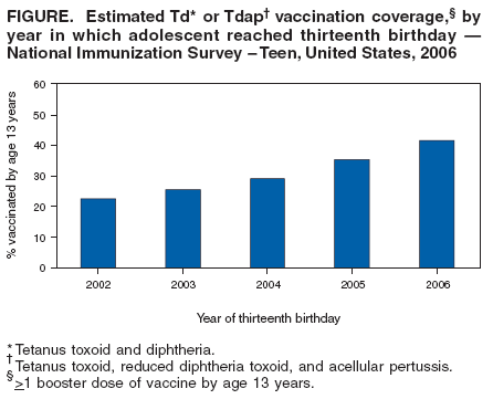 During 2002--2006, an increasing percentage of children were receiving Td or Tdap by age 13 years, as recommended by ACIP; however, overall coverage (60.1%) remained low, and coverage among adolescents aged 13--15 years (56.7%) was still below the national objective of 90%. Tdap coverage alone was low (10.8%), although a low level was expected because Tdap recommendations were published only 1--2 years before this survey was conducted. The lower Tdap vaccination coverage among older adolescents (aged 16--17 years) compared with younger adolescents (aged 13--15 years) might be a result of the time interval required between Td and Tdap vaccinations; Td vaccination coverage increased with age, and a 5-year interval is recommended before administering Tdap vaccine. Alternately, the higher Tdap coverage among younger adolescents might be a reflection of health-care use patterns; younger adolescents are more likely to have preventive health-care visits, when vaccinations are typically administered, than older adolescents (8).