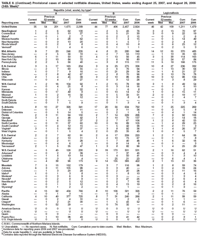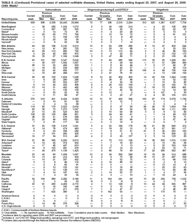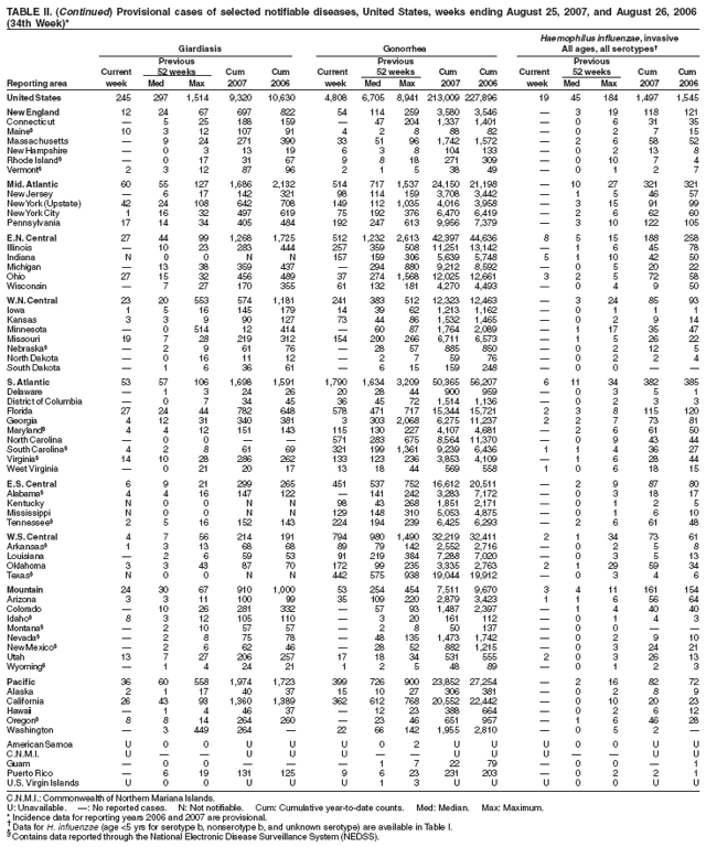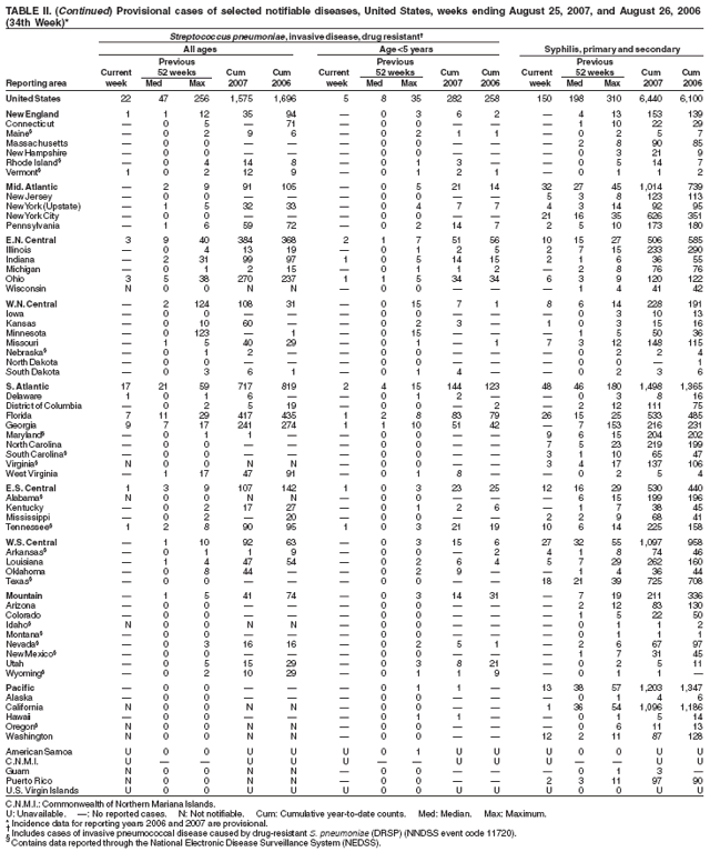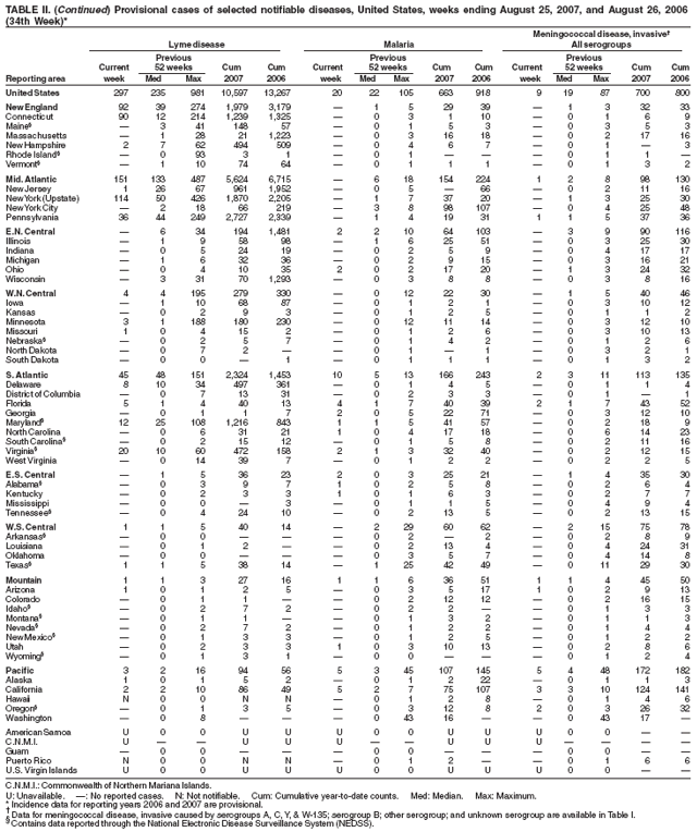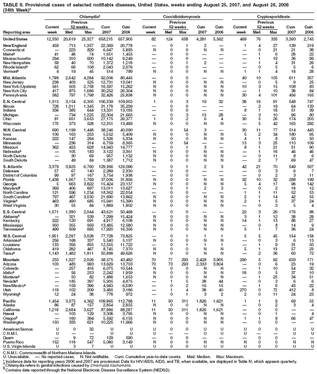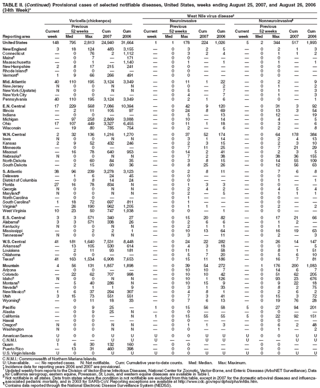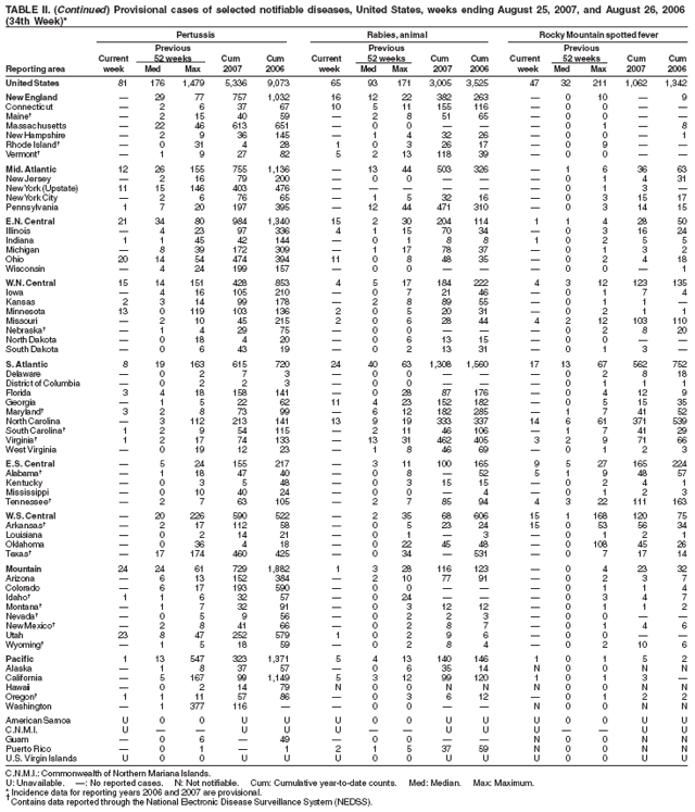 Persons using assistive technology might not be able to fully access information in this file. For assistance, please send e-mail to: mmwrq@cdc.gov. Type 508 Accommodation and the title of the report in the subject line of e-mail. Notifiable Diseases/Deaths in Selected Cities Weekly InformationFigure I Selected notifiable disease reports, United States, comparison of provisional 4-week totals ending August 25, 2007, with historical data Table I Summary of provisional cases of selected notifiable diseases, United States, cumulative, week ending August 25, 2007 (34th Week) Table II Provisional cases of selected notifiable diseases, United States, weeks ending August 25, 2007 and August 26, 2006 (34th Week) Table III Deaths in 122 U.S. cities, week ending August 25, 2007 (34th Week) Figure I ![]() Return to top. Table I ![]() Return to top. Table II