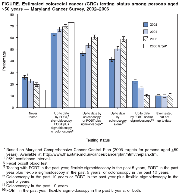 During 2000--2004, Maryland had the thirteenth highest mortality rate for colorectal cancer (CRC) among the 50 states and the District of Columbia (1). The American Cancer Society (ACS), the U.S. Preventive Services Task Force, and other organizations recommend that adults begin CRC screening at age 50 years if they are at average risk for CRC and before age 50 years if they are at increased risk (2,3). For those at average risk, ACS recommends screening with 1) a fecal occult blood test (FOBT) or fecal immunochemical test (FIT) every year, 2) flexible sigmoidoscopy every 5 years, 3) an annual FOBT or FIT combined with flexible sigmoidoscopy every 5 years,* 4) double-contrast barium enema (DCBE) every 5 years, or 5) colonoscopy every 10 years (2). In 2002, the Maryland Department of Health and Mental Hygiene initiated the Maryland Cancer Survey (MCS) to assess testing prevalence and risk behaviors for seven types of cancer, including CRC. Reducing CRC mortality and disparities in CRC incidence and mortality are goals described in Maryland's Comprehensive Cancer Control Plan (MCCCP) (4). As milestones toward these goals, Maryland set the following targets for 2008 for persons aged >50 years: 1) decrease the percentage of Maryland residents who have never been screened for CRC to <15% (from a 2002 baseline of 25.9%); 2) increase the percentage of residents who are up to date with CRC screening (per ACS guidelines) to >73% (from a 2002 baseline of 63.8%); and 3) increase the percentage of residents who have been screened with either colonoscopy in the past 10 years, or FOBT in the past year plus flexible sigmoidoscopy in the past 5 years, to >57% (from a baseline of 46.5% in 2002). This report describes trends in CRC test use based on results from MCS surveys completed in 2002, 2004, and 2006. The results indicated a significant decline (6.1 percentage points) in the percentage of Maryland residents aged >50 years who had never been tested for CRC, a 5.4 percentage-point increase in prevalence of up-to-date testing by any method, and a 13.9 percentage-point increase in prevalence of either colonoscopy in the past 10 years or FOBT in the past year plus flexible sigmoidoscopy in the past 5 years. However, Maryland residents who were neither white nor black (i.e., persons of other races) had a significantly lower prevalence of ever having a CRC test, as did persons without health insurance or those without a recent checkup. Although overall increases in CRC testing reflect substantial progress in Maryland, additional measures are needed to increase CRC testing among racial minority groups and the medically underserved.