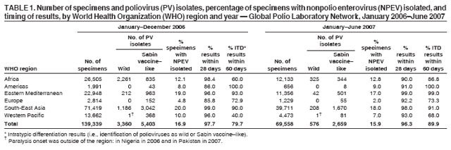 Persons using assistive technology might not be able to fully access information in this file. For assistance, please send e-mail to: mmwrq@cdc.gov. Type 508 Accommodation and the title of the report in the subject line of e-mail. Laboratory Surveillance for Wild and Vaccine-Derived Polioviruses --- Worldwide, January 2006--June 2007The Global Polio Laboratory Network (GPLN) was established after announcement of the 1988 World Health Assembly resolution to eradicate poliomyelitis. Operating in all six World Health Organization (WHO) regions, the network currently has 146 laboratories that test stool specimens from acute flaccid paralysis (AFP) patients* for polioviruses. The virologic data provided by GPLN underpin the global polio eradication initiative, guiding decisions regarding where targeted immunization activities should be conducted, based on confirmed wild or vaccine-derived poliovirus circulation. The data also are used to monitor progress toward polio eradication by documenting the genetic diversity and transmission links of viral isolates. This report updates previous reports (1--6) and describes GPLN performance and initiatives during January 2006--June 2007. Laboratory Network PerformanceGPLN uses standardized methods, and the quality, timeliness, and accuracy of network results are evaluated against performance targets through an accreditation program administered by WHO that includes proficiency testing and periodic on-site performance reviews. By 2006, WHO had accredited 93% of the network laboratories. Nonaccredited laboratories continue to test specimens, but in parallel with accredited laboratories until any performance problems are resolved. During January 2006--June 2007, GPLN analyzed 208,897 stool specimens, a 55% increase from January 2005--June 2006 (1). The number of tests increased primarily as a result of a decision to increase AFP surveillance sensitivity in polio-endemic regions (Africa, Eastern Mediterranean, and South-East Asia), but also as a result of an upsurge in wild poliovirus transmission in Nigeria and India and virus importations into several other countries. All six WHO regions met the program target of >80% of laboratories providing virus isolation results within 28 days (Table 1). A second target, >80% of laboratories obtaining intratypic differentiation (ITD) (i.e., identification of polioviruses as wild or Sabin vaccine--like) results within 60 days of paralysis onset, was not met in three regions (Africa, Europe, and Western Pacific). However, failure to meet the 60-day target usually resulted from shipping delays that were beyond the control of laboratories. Detection and Characterization of Wild PoliovirusesDuring January 2006--June 2007, GPLN confirmed wild polioviruses in 18 countries (Table 2). Only wild poliovirus types 1 (PV1) and 3 (PV3) were detected. Wild poliovirus type 2 (PV2) was last detected in Uttar Pradesh, India, in 1999 and appears to have been eradicated (7). To monitor pathways of virus transmission, GPLN sequences and analyzes the genomic region encoding the major virus surface protein (VP1) (approximately 900 nucleotides) of all wild polioviruses. Detected viruses belonged to four genotypes: South Asia (SOAS) PV1, West Africa B (WEAF-B) PV1, SOAS PV3, and WEAF-B PV3. During January 2006--June 2007, indigenous PV1 and PV3 were identified in four countries (Afghanistan, India, Nigeria, and Pakistan). Imported viruses of Nigerian origin were identified in eight countries (Cameroon, Chad, Ethiopia, Indonesia, Kenya, Niger, Somalia, and Yemen) where polio is not endemic; viruses of Indian origin were identified in six countries (Angola, Bangladesh, Democratic Republic of the Congo, Myanmar, Namibia, and Nepal) where polio is not endemic. Most of the imported virus was PV1 introduced in 2005 (five countries) or 2006 (eight additional countries). Single-case importations of PV3 of Nigerian origin were reported in 2006 in Niger (two episodes), Cameroon, and Chad. Myanmar was the only country with a newly reported PV1 importation in 2007. Detection of Vaccine-Derived PoliovirusesVaccine-derived polioviruses (VDPVs) are polioviruses with >1% VP1 nucleotide sequence difference from the parental Sabin vaccine strain of the same type. Concern has increased over the potential for VDPV epidemics since confirmation of a VDPV outbreak in Hispaniola in 2000 (8). VDPVs are subdivided into three categories: 1) circulating VDPVs (cVDPVs) with transmission resulting in more than one patient with paralysis; 2) VDPVs obtained from persons with primary immunodeficiencies (iVDPVs); and 3) ambiguous VDPVs (aVDPVs) isolated from nonimmunodeficient persons, non-AFP patient sources, or a single AFP patient whose case cannot be assigned to the other two VDPV categories (9). GPLN has screened all Sabin vaccine--related isolates from AFP cases since 1999. During January 2006--June 2007, vaccine-related isolates were observed in 7,311 specimens from AFP cases (Table 3), including 7,190 (98.3%) categorized as Sabin vaccine--like viruses and 121 (1.7%) categorized as VDPVs; 107 VDPVs were detected during cVDPV outbreaks, 12 were iVDPVs, and two were aVDPVs. The cVDPV outbreaks occurred in Myanmar (four cases of type 1; data as of September 7, 2007) and Nigeria (66 cases of type 2; data as of September 7, 2007); in 2006, two single-case importations of VDPVs from Nigeria were reported in Niger. Four specimens from Nigeria yielded type 2 VDPV and wild poliovirus mixtures (two with wild PV1 and two with wild PV3). Two specimens from one AFP case in Cambodia in 2006 had type 3 VDPVs genetically linked to cVDPVs detected in 2005. iVDPVs were isolated from seven persons with primary immunodeficiencies during the same period. Three persons had type 2 viruses (detected in Iran, in Syria, and in France in a child of Tunisian origin), one was coinfected with types 1 and 2 VDPVs (in Iran), and three had type 3 VDPVs (in Egypt, Iran, and Kuwait). Six of the immunod
