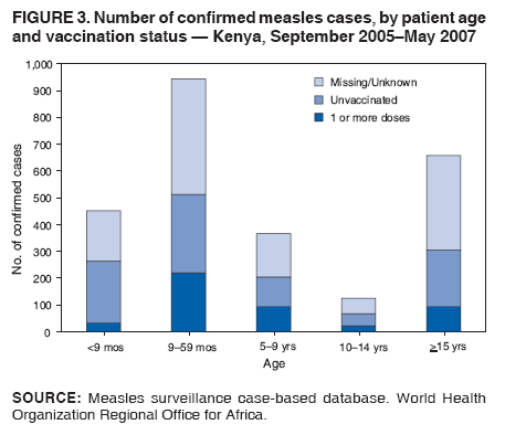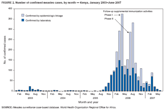 Persons using assistive technology might not be able to fully access information in this file. For assistance, please send e-mail to: mmwrq@cdc.gov. Type 508 Accommodation and the title of the report in the subject line of e-mail. Progress in Measles Control --- Kenya 2002--2007In 2000, countries represented by the World Health Organization (WHO) Regional Office for Africa established a goal to reduce, by the end of 2005, measles mortality to 50% of the 506,000 deaths from measles estimated in 1999 (1). Strategies adopted included strengthening routine vaccination, providing a second opportunity for measles vaccination through supplemental immunization activities (SIAs), monitoring disease trends, and improving measles case management. In Kenya, an east African country with a population estimated at 33.4 million in 2005, the Kenya Expanded Programme on Immunization (KEPI) in the Ministry of Health began implementing these strategies in 2002 with a wide age range catch-up SIA* and reduced the number of reported measles cases by >99%, from 11,304 in 2001 to 20 in 2004. A follow-up SIA, initially scheduled for July 2005, was postponed to 2006 to include concurrent distribution of long-lasting insecticide-treated bednets (LLINs). This report documents progress made in reducing measles morbidity and mortality in Kenya and describes the consequences of a large measles outbreak, beginning in September 2005, on the integrated measles follow-up SIA. Immunization ActivitiesKEPI was established within the Kenya Ministry of Health in 1980, with the goal of immunizing all children in the country against six vaccine-preventable diseases.§ National coverage with 1 dose of measles vaccine (provided at age 9 months) increased in the early 1990s to 84% of children aged 12 months but decreased to 72% in 2002 (Figure 1). To accelerate measles control, goals were established in 2002 to achieve and maintain national average measles vaccination coverage at 90%, with every district expected to attain a coverage of >85%. Since then, reported national measles vaccination coverage increased to 77% in 2006 (Figure 1), and the proportion of districts with coverage >85% increased from 10% in 2002 (eight of 77 districts) to 35% in 2006 (27 of 78 districts).¶ To provide a second opportunity for measles vaccination, a nationwide measles catch-up SIA was conducted in June 2002, targeting children aged 9 months--14 years; approximately 13 million children were vaccinated, 98% of the estimated target population. A multistage cluster survey provided a similar estimate of national measles SIA coverage at 94%, with seven of nine provinces achieving coverage >90%. The two exceptions were North East Province at 84% and Coast Province at 90%. Measles SurveillanceAfter the 2002 measles catch-up SIA, Kenya implemented a system of case-based surveillance for measles within the existing surveillance network for acute flaccid paralysis. In this system, for each suspected measles patient who visits a health facility, a measles case report form is completed, and a blood specimen is taken for measles immunoglobulin M testing at the national measles laboratory. In an outbreak, defined as five or more cases reported from the same health area in a month, specimens are collected from five cases. If three or more test positive, the outbreak is confirmed as measles, untested cases are confirmed by epidemiologic linkage, and specimen collection stops after throat swabs are collected for viral genotyping. In 2003, a total of 1,791 suspected measles cases were reported through this case-based surveillance system, including 59 cases that were confirmed by laboratory or epidemiologic linkage. In 2004, a total of 1,968 suspected cases were reported, including 20 that were confirmed; in 2005, a total of 1,061 suspected cases were reported, including 151 that were confirmed. During 2003--2005, more than 99% of suspected cases were reported with a blood specimen, and the proportion of districts reporting at least one suspected measles case increased from 69% in 2004 to 99% in 2005.** Measles Outbreak and Follow-up SIAA follow-up measles SIA had been planned for July 2005, approximately 36 months after the initial catch-up SIA in June 2002, an interval between SIAs recommended by the African Regional Measles Technical Advisory Group (2). However, to expedite meeting the 2005 World Health Assembly target of 80% of children aged <5 years sleeping under an insecticide-treated bednet, the Kenya Ministry of Health and the Inter-Agency Coordinating Committee decided to integrate distribution of LLINs with the measles follow-up SIA. Raising additional funds for procurement and distribution of the LLINs required postponement of the SIA, initially to July 2006. In September 2005, a cluster of laboratory-confirmed measles cases was reported from a predominantly Somali immigrant community in Nairobi. During September 2005--May 2007, this outbreak grew to a total of 2,544 confirmed measles cases reported from 71 (91%) of the 78 districts, with peak monthly totals of 375 and 332 confirmed cases reported in April and August 2006, respectively (Figure 2). Viruses were isolated from specimens collected from approximately 80 persons and identified as genotype B3, with one additional virus from Rift Valley Province identified as D4. Of the 2,544 confirmed outbreak cases, 944 (37%) were in persons aged 9--59 months, 491 (19%) were in persons aged 5--14 years, and 658 (26%) were in persons aged >15 years. A history of measles vaccination was provided by 466 (18%) of the patients, including 220 (23%) of the 944 children aged 9--59 months and 95 (26%) of the 366 children aged 5--9 years. Vaccination status was unknown for 1,192 persons (47%) (Figure 3). During the outbreak, 24 measles deaths were documented; 17 of the decedents were children aged <5 years, and nine had a history of measles vaccination. In response to this outbreak, the planned follow-up SIA was moved forw