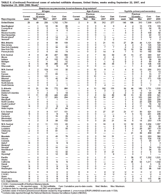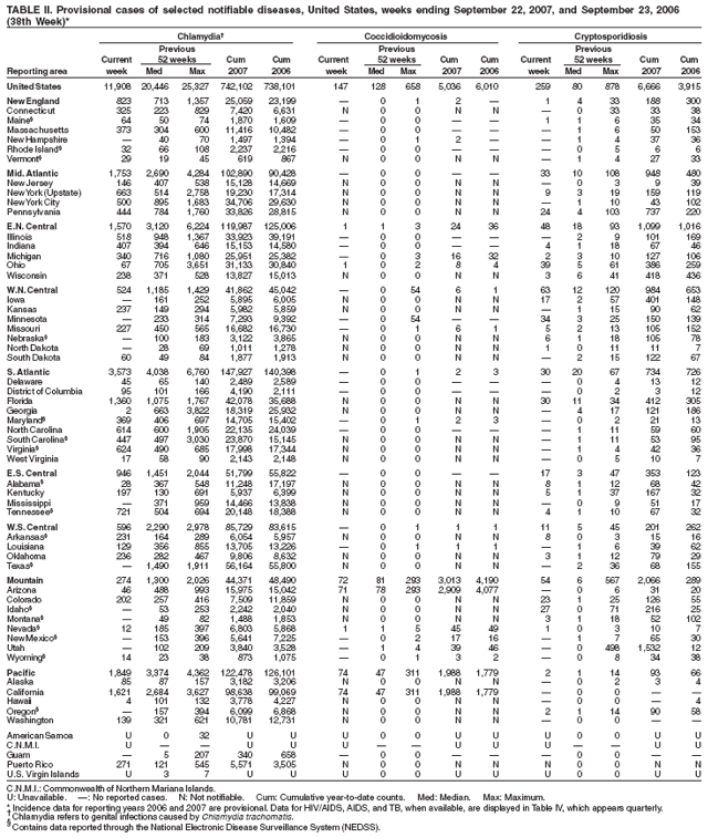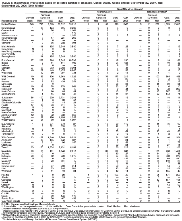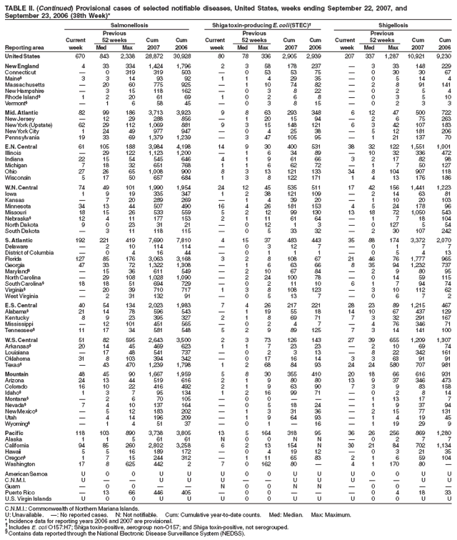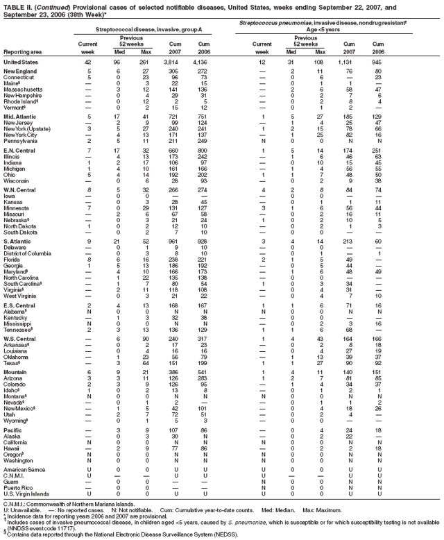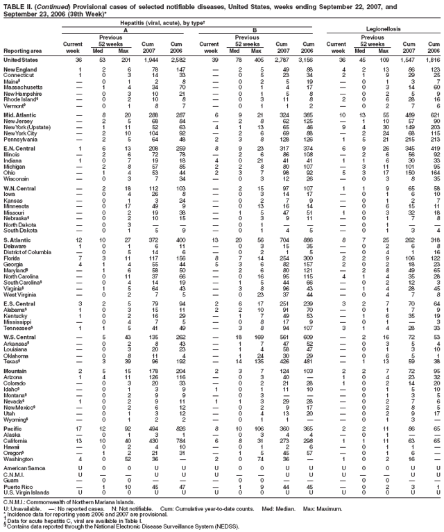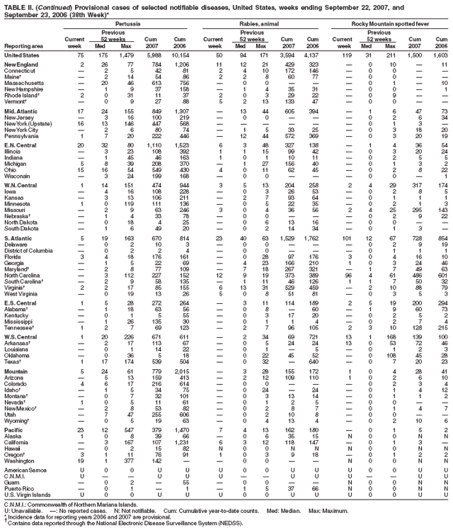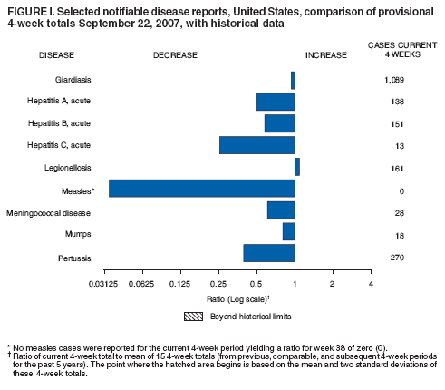 Persons using assistive technology might not be able to fully access information in this file. For assistance, please send e-mail to: mmwrq@cdc.gov. Type 508 Accommodation and the title of the report in the subject line of e-mail. Notifiable Diseases/Deaths in Selected Cities Weekly InformationFigure I Selected notifiable disease reports, United States, comparison of provisional 4-week totals ending September 22, 2007, with historical data Table I Summary of provisional cases of selected notifiable diseases, United States, cumulative, week ending September 22, 2007 (38th Week) Table II Provisional cases of selected notifiable diseases, United States, weeks ending September 22, 2007 and September 23, 2006 (38th Week) Table III Deaths in 122 U.S. cities, week ending September 22, 2007 (38th Week) Figure I ![]() Return to top. Table I ![]() Return to top. Table II