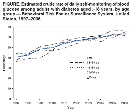 Persons using assistive technology might not be able to fully access information in this file. For assistance, please send e-mail to: mmwrq@cdc.gov. Type 508 Accommodation and the title of the report in the subject line of e-mail. Self-Monitoring of Blood Glucose Among Adults with Diabetes --- United States, 1997--2006Blood-glucose control is critical for managing diabetes and preventing diabetes-related complications such as cardiovascular disease, retinopathy, nephropathy, and neuropathy (1). In addition to recommending that patients with diabetes have a glycated hemoglobin (HbA1c) measurement at least two times a year, the American Diabetes Association recommends self-monitoring of blood glucose (SMBG) as an integral part of diabetes management for patients who are treated with insulin and as a useful component for achieving glycemic goals for patients who use oral medications or medical nutrition therapy (2). One of the Healthy People 2010 national objectives is to increase to 61% the proportion of persons with diabetes who perform SMBG at least once a day (objective 5--17) (3). To estimate the rates of SMBG and to track the progress of states during 1997--2006, CDC analyzed data from the Behavioral Risk Factor Surveillance System (BRFSS) for that period. This report summarizes the findings of that analysis, which indicated that the proportion of adults with diabetes who check their blood glucose at least once a day increased at the national level, and 25 of the 38 states examined had statistically significant rate increases from 1997 to 2006. In 2006, the daily SMBG rate was 63.4% among all adults with diabetes and 86.7% among those treated with insulin. Collaborations to ensure adequate health insurance coverage, diabetes education and counseling to encourage more intensive medical care and self-management practices, and continued surveillance measures to track changes in SMBG rates are needed to improve and monitor SMBG trends. BRFSS is an ongoing state-based, random-digit--dialed telephone survey of the noninstitutionalized, U.S. civilian population aged >18 years; the survey is conducted in all 50 states, the District of Columbia, and three U.S. territories. The survey sample size ranged from 135,582 in 1997 to 356,112 in 2005. The median response rate* among jurisdictions was 62.5% (range: 41.3%--88.9%) in 1997 and 51.4% (range: 35.1%--66.0%) in 2006, based on Council of American Survey and Research Organizations (CASRO) guidelines. The median cooperation rate was 65.9% (range: 46.8%--90.1%) in 1997 and 74.5% (range: 56.9%--83.5%) in 2006. Persons with diabetes were defined as respondents who answered "yes" to the question, "Have you ever been told by a doctor that you have diabetes?" Women who said they were told that they had diabetes only during pregnancy and respondents who stated they had prediabetes or borderline diabetes were not included. Daily SMBG was determined by response to the question, "About how often do you check your blood for glucose or sugar?" Statistical software was used to analyze data, incorporating the survey sampling design and sampling weights to make results representative of the U.S. population. Linear regression weighting the annual estimates by the inverse of their variances was used to test for 10-year national trends in SMBG. Logistic regression was used to identify factors associated with self-monitoring. A t test was used to compare rate differences between 1997 and 2006 at the state level. Results were considered significant if p<0.05, unless otherwise noted. In 2006, 63.4% (95% confidence interval [CI] = 62.2%--64.7%) of adults with diabetes aged >18 years reported self-monitoring their blood glucose at least once a day (Table 1), exceeding the Healthy People 2010 target of 61%. Among adults treated with insulin, 86.7% (CI = 84.9%--88.4%) checked their blood glucose at least daily. The overall rate of SMBG increased from 40.6% in 1997 to 63.4% in 2006 among adults with diabetes. The modeled average annual increase was 2.5 percentage points (Figure). Rates increased across all age groups examined, from 44.0% to 65.5% (with an annual increase of 2.4 percentage points) among persons aged 18--44 years, from 42.9% to 62.4% (with an annual increase of 2.2 percentage points) among those aged 45--64 years, from 37.3% to 65.9% (with an annual increase of 2.9 percentage points) among those aged 65--74 years, and from 36.4% to 61.5% (with an annual increase of 3.0 percentage points) among those aged >75 years (Figure). During 2006, the state-specific rates of SMBG among adults with diabetes ranged from 47.1% to 78.2% (Table 2). From 1997 to 2006, a total of 25 of the 38 states collecting data in both 1997 and 2006 had significant rate increases, and no state had a significant decrease (Table 2). In multivariate analyses of 2006 data, the following had significant positive associations with daily SMBG: having a high school education compared with having less than a high school education (adjusted odds ratio [AOR] = 1.4); having health insurance coverage (AOR = 1.4); using oral medication only (AOR = 2.7), insulin only (AOR = 11.0), or both insulin and oral medication (AOR = 7.8) compared with not using insulin or oral medication; making doctor visits 1--2 times (AOR = 1.5), 3--4 times (AOR = 2.3), 5--10 times (AOR = 2.1), or >11 times (AOR = 2.6) annually compared with making no visits; and having ever taken a diabetes-education course (AOR = 1.6) (Table 1). In contrast, being male (AOR = 0.7) was associated with decreased odds for daily SMBG. Reported by: L Pan, MD, Q Mukhtar, PhD, LS Geiss, MA, Div of Diabetes Translation, National Center for Chronic Disease Prevention and Health Promotion, CDC. Editorial Note:SMBG allows patients to adjust food intake, physical activity, or pharmacologic therapy in response to their blood-glucose readings and to assess whether their blood-glucose levels are under control (2). In 2006, the national rate of SMBG exceed