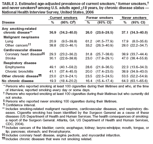 Persons using assistive technology might not be able to fully access information in this file. For assistance, please send e-mail to: mmwrq@cdc.gov. Type 508 Accommodation and the title of the report in the subject line of e-mail. Cigarette Smoking Among Adults --- United States, 2006One of the national health objectives for 2010 is to reduce the prevalence of cigarette smoking among adults to <12% (objective 7-1a) (1). To assess progress toward achieving this objective, CDC analyzed data from the 2006 National Health Interview Survey (NHIS). This report summarizes the results of that analysis, which indicated that in 2006, approximately 20.8% of U.S. adults were current cigarette smokers. This prevalence had not changed significantly since 2004 (2), suggesting a stall in the previous 7-year (1997--2004) decline in cigarette smoking among adults in the United States. In addition, the findings indicated that persons with a diagnosis of a smoking-related chronic disease have a significantly higher prevalence of being a current smoker than persons with other chronic diseases or persons with no chronic disease. To reduce smoking prevalence further in the United States, comprehensive, evidence-based approaches for preventing smoking initiation and increasing cessation, including clinical interventions for populations at high risk, need to be fully implemented (3). The 2006 NHIS adult core questionnaire, containing questions on cigarette smoking and cessation attempts, was administered by in-person interview to a nationally representative sample of 24,275 persons in the noninstitutionalized U.S. civilian population aged >18 years; the overall response rate was 70.8%. To classify smoking status, respondents were asked, "Have you smoked at least 100 cigarettes in your entire life?"; Those who answered "yes" were asked, "Do you now smoke cigarettes every day, some days, or not at all?" Ever smokers were defined as those who reported having smoked at least 100 cigarettes during their lifetimes. Current smokers were those who had smoked at least 100 cigarettes during their lifetimes and, at the time of the interview, reported smoking every day or some days. Former smokers were those who reported smoking at least 100 cigarettes during their lifetimes but currently did not smoke. Never smokers were those who reported never having smoked 100 cigarettes during their lifetimes. Among current cigarette smokers, making at least one cessation attempt during the preceding year was defined as a "yes" response to the question, "During the past 12 months, have you stopped smoking for more than one day because you were trying to quit smoking?" Respondents were categorized as having a chronic disease if they answered "yes" to any one of a series of questions about 42 chronic diseases (i.e., "Have you ever been told by a doctor or other health professional that you had...?"); of these chronic diseases, 16 were considered to be smoking related* (4). Data were adjusted for nonresponse and weighted to provide national estimates of cigarette smoking prevalence. Because the distribution of smoking-related morbidity varies by age, estimates of current, former, and never smokers by chronic disease status were age adjusted to the 2000 U.S. adult population; 95% confidence intervals were calculated using statistical analysis software to account for the survey's multistage probability sample design. Statistical significance was determined by non-overlapping confidence intervals. In 2006, an estimated 20.8% (45.3 million) of U.S. adults were current cigarette smokers; of these, 80.1% (36.3 million) smoked every day, and 19.9% (9.0 million) smoked some days. Among current cigarette smokers, an estimated 44.2% (19.9 million) had stopped smoking for more than 1 day during the preceding 12 months because they were trying to quit. Of the estimated 91 million persons who had smoked at least 100 cigarettes during their lifetimes (i.e., ever smokers), 50.2% (45.7 million) had quit smoking at the time of the interview. The prevalence of current cigarette smoking varied substantially among population subgroups. By sex, prevalence was higher among men (23.9%) than women (18.0%) (Table 1). Among racial/ethnic groups, Asians had the lowest prevalence (10.4%). Hispanics had a significantly lower prevalence of smoking (15.2%) than American Indians/Alaska Natives (32.4%), non-Hispanic blacks (23.0%), and non-Hispanic whites (21.9%). Prevalence also varied by level of education. Smoking prevalence was highest among adults who had earned a General Educational Development (GED) diploma (46.0%) and those with 9--11 years of education (35.4%); overall, smoking prevalence decreased as education level increased. By age group, adults aged 18--24 years and 25--44 years had the highest prevalence of smoking (23.9% and 23.5%, respectively). The prevalence of current smoking was higher among adults living below the federal poverty level (30.6%) than among those at or above this level (20.4%). Before 2006, certain population subgroups already had achieved smoking prevalences that were lower than the national health objective of 12%, and the prevalences remained low in 2006. These included Hispanic (10.1%) and Asian (4.6%) women, women with undergraduate (8.4%) or graduate (5.8%) degrees, men with undergraduate (10.8%) or graduate (7.3%) degrees, and women aged >65 years (8.3%). In 2006, the age-adjusted prevalence of current smoking was 36.9% among persons with a smoking-related chronic disease and 19.3% among those without a chronic disease (Table 2). Current smoking prevalence was higher among persons with smoking-related cancers (other than lung cancer) (38.8%), coronary heart disease (CHD) (29.3%), and stroke (30.1%) than among persons without chronic diseases, and nearly half (49.1%) of U.S. adults with emphysema and 41.1% of those with chronic bronchitis were current smokers. With the exception of persons who had a stroke, persons with any smokin