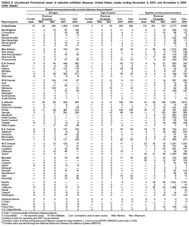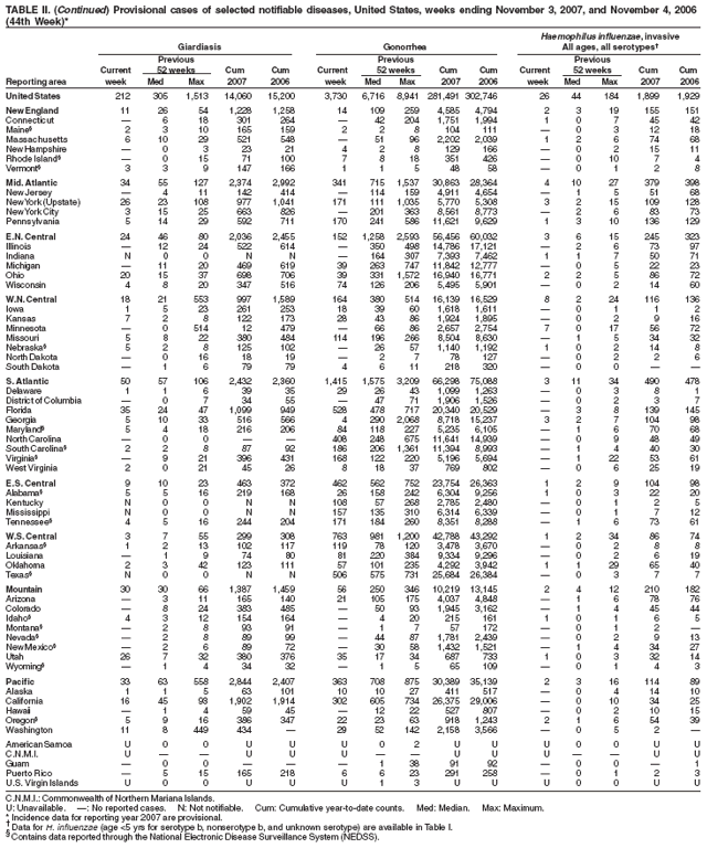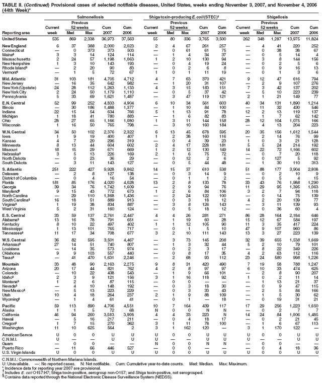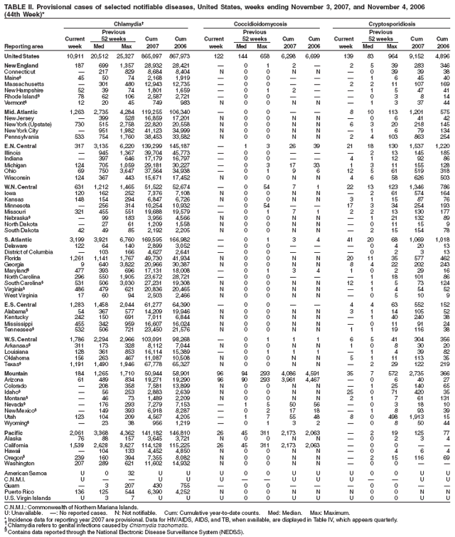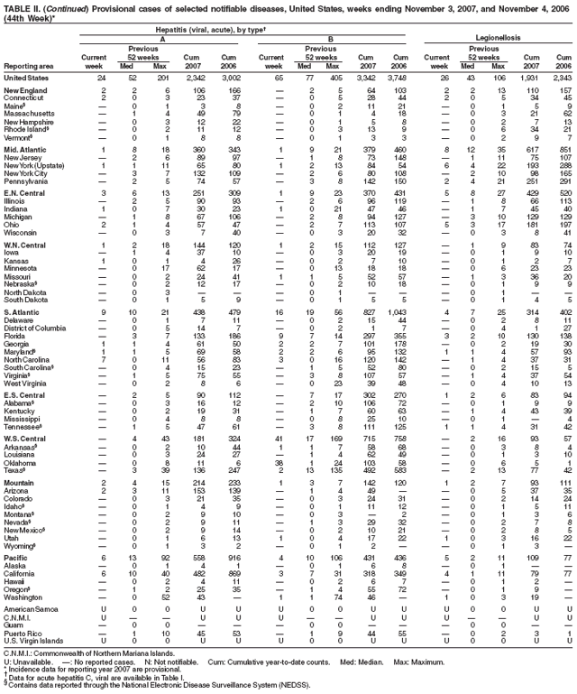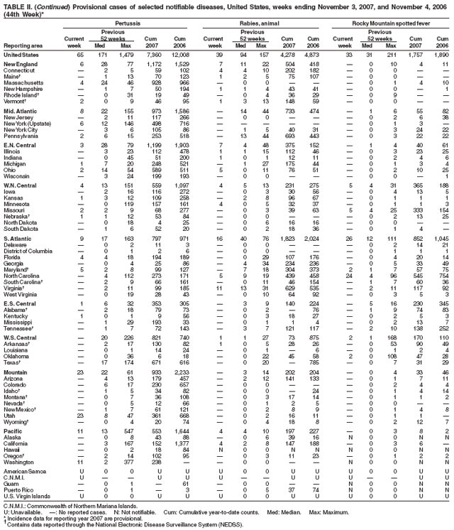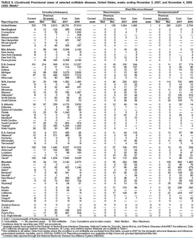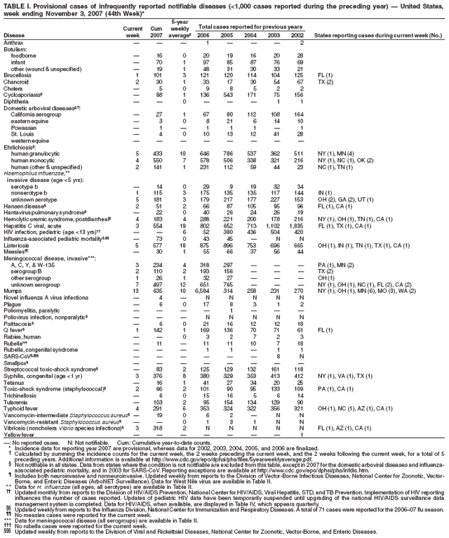 Persons using assistive technology might not be able to fully access information in this file. For assistance, please send e-mail to: mmwrq@cdc.gov. Type 508 Accommodation and the title of the report in the subject line of e-mail. Notifiable Diseases/Deaths in Selected Cities Weekly InformationFigure I Selected notifiable disease reports, United States, comparison of provisional 4-week totals ending November 3, 2007, with historical data Table I Summary of provisional cases of selected notifiable diseases, United States, cumulative, week ending November 3, 2007 (44th Week) Table II Provisional cases of selected notifiable diseases, United States, weeks ending November 3, 2007 and November 4, 2006 (44th Week) Table III Deaths in 122 U.S. cities, week ending November 3, 2007 (44th Week) Figure I ![]() Return to top. Table I ![]() Return to top. Table II