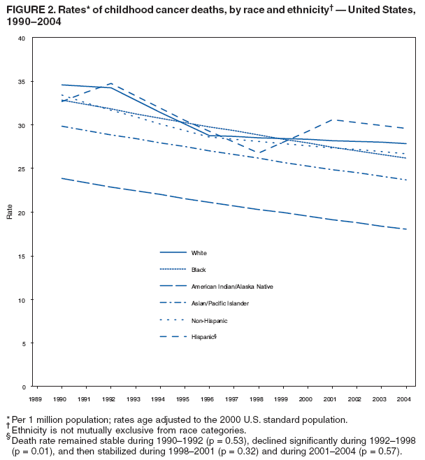 Persons using assistive technology might not be able to fully access information in this file. For assistance, please send e-mail to: mmwrq@cdc.gov. Type 508 Accommodation and the title of the report in the subject line of e-mail. Trends in Childhood Cancer Mortality --- United States, 1990--2004Cancer is the fourth most common cause of death (after unintentional injury, homicide, and suicide) among persons aged 1--19 years in the United States (1,2). Because recent childhood cancer mortality has not been well characterized in terms of temporal, demographic, and geographic trends (2,3), CDC analyzed cancer death rates among children (defined as aged 0--14 years) and adolescents (defined as aged 15--19 years) for the period 1990--2004 by sex, age group, race, ethnicity, U.S. Census region, and primary cancer site/leading diagnosis, using the most recent data available from the National Vital Statistics System (NVSS). This report describes the results of that analysis, which indicated that, overall, age-adjusted childhood cancer death rates decreased significantly during 1990--2004 among both sexes, both age groups, all races (except American Indians/Alaska Natives [AI/ANs]), Hispanics, non-Hispanics, and all U.S. Census regions. However, decreases in death rates varied among U.S. Census regions and between Hispanics and non-Hispanics. Eliminating racial/ethnic health disparities is one of the overarching goals of Healthy People 2010 (4). Further research is needed to understand geographic and ethnic disparities in childhood cancer death rates. Moreover, cancer prevention and intervention measures should be designed to reach populations that are underserved and at high risk. NVSS collects death certificate data from vital statistics offices in the 50 states and the District of Columbia.* All reported deaths among children and adolescents during 1990--2004 were included in this analysis. Population estimates used as denominators in death rate calculations were from the U.S. Bureau of the Census and were modified by the Surveillance, Epidemiology, and End Results (SEER) program (1). Age-adjusted death rates and trends were calculated for all primary cancer sites combined and for the two leading cancer diagnoses: leukemias and brain and other nervous system neoplasms.§ All rates were per 1 million population and age adjusted to the 2000 U.S. standard population. For all primary cancer sites/leading diagnoses combined, death rates and trends were stratified further by sex, age, race, ethnicity, and U.S. Census region. Rates and overall annual percentage changes (APCs) from 1990 to 2004 were calculated using SEER-Stat.¶ Joinpoint regression was performed to determine statistically significant changes in trends during 1990--2004 (5). The overall statistical significance level was a = 0.05, with a maximum of three joinpoints and four line segments allowed (5). A total of 34,500 childhood cancer deaths were reported in the United States during 1990--2004. A total of 2,223 cancer deaths occurred in 2004; among these, leukemias were the most common diagnoses (25.5%), followed by brain and other nervous system neoplasms (25.0%) (Figure 1). From 1990 to 2004, death rates declined significantly for leukemias by 3.0% per year, for brain and other nervous system neoplasms by 1.0% per year, and for all other cancers combined by 1.3% per year (Table). For all cancers combined during 1990--2004, boys (33.1 per million) had significantly higher death rates than girls (26.1); adolescents (37.9) had significantly higher death rates than children (26.9); whites (30.1) and blacks (29.3) had significantly higher death rates than Asians/Pacific Islanders (A/PIs) (26.4) and AI/ANs (20.0), respectively; and Hispanics (30.3) had significantly higher death rates than non-Hispanics (29.1) (Table). Death rates decreased similarly by sex, age group, and race; decreases ranged from 1.5% to 2.0% per year during 1990--2004. However, APCs, reflecting a decline in death rates, differed by 60% between Hispanics and non-Hispanics: 1.0% per year for Hispanics compared with 1.6% per year for non-Hispanics. Statistical analysis with joinpoint regression revealed that the death rate for whites remained stable during 1990--1992 (p = 0.77), declined significantly during 1992--1996 by 4.3% per year (p = 0.001), and then stabilized again during 1996--2004 (p = 0.07) (Figure 2). Death rates for blacks and A/PIs declined significantly, both by 1.6% per year (p<0.001 for blacks and p = 0.003 for A/PIs). Death rates for AI/ANs were stable during 1990--2004 (p = 0.18); this trend might be attributed to the small numbers available for analysis in this population. Regression analysis also revealed that the death rate for Hispanics remained stable during 1990--1992 (p = 0.53), declined significantly during 1992--1998 by 4.3% per year (p = 0.01), and then stabilized during 1998--2001 (p = 0.32) and during 2001--2004 (p = 0.57); the death rate for non-Hispanics declined significantly during 1990--1996 by 2.6% per year (p<0.001) and 1996--2004 by 0.9% per year (p = 0.009) (Figure 2). Death rates did not decrease equally in all regions** during 1990--2004: 2.1% per year in the Midwest, 1.8% per year in the South and Northeast, and 1.4% per year in the West (Table). For all cancers combined, children and adolescents living in the West (31.1 per million) had significantly higher death rates than those living in the Midwest (29.1), the Northeast (28.4), and the South (29.8), respectively (Table). Reported by: LA Pollack, MD, SL Stewart, PhD, TD Thompson, Div of Cancer Prevention and Control, National Center for Chronic Disease Prevention and Health Promotion; J Li, MD, EIS Officer, CDC. Editorial Note:The findings in this report indicate that, during 1990--2004, overall childhood cancer death rates declined significantly among boys and girls, children and adolescents, Hispanics and non-Hispanics, most racial groups, and all U.S. Census regions. Inc