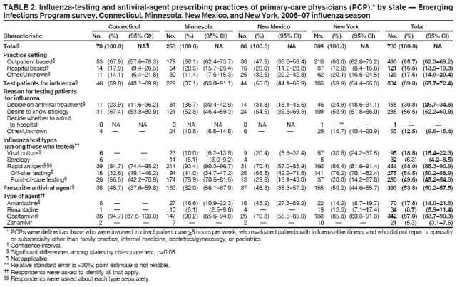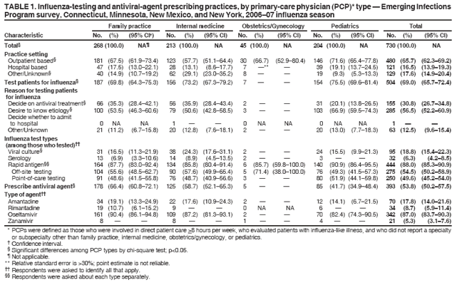 Persons using assistive technology might not be able to fully access information in this file. For assistance, please send e-mail to: mmwrq@cdc.gov. Type 508 Accommodation and the title of the report in the subject line of e-mail. Influenza-Testing and Antiviral-Agent Prescribing Practices --- Connecticut, Minnesota, New Mexico, and New York, 2006--07 Influenza SeasonInfluenza is a major cause of morbidity and mortality in the United States, with an average of 36,000 deaths attributed to the disease annually (1). Patients with influenza-like illness (ILI) often are evaluated by their primary-care physicians (PCPs). Antiviral therapy initiated within 48 hours of ILI symptom onset can shorten the course of influenza illness; antiviral therapy also is used as chemoprophylaxis for influenza, particularly in institutions and communities (2). Early laboratory diagnosis and knowing when influenza is circulating in the community can guide effective clinical management. To assess influenza-testing and antiviral-agent prescribing practices during the 2006--07 influenza season, personnel at four of 10 Emerging Infections Program (EIP) sites with influenza hospitalization surveillance surveyed PCPs. This report describes the results of that survey, which indicated that 69.0% of the PCPs administered influenza tests to patients who had ILI during the influenza season and 53.8% prescribed antiviral agents, including two (i.e., amantadine and rimantadine) no longer recommended by CDC. Health agencies, medical societies, and continuing medical education organizations should advance programs for physicians that increase awareness of recommendations regarding appropriate influenza testing and use of antiviral agents. EIP is a network of state health departments, academic institutions, and local collaborators funded by CDC to assess the effect of emerging infections and evaluate methods for their prevention and control.* EIP personnel identified PCPs (defined as physicians in family practice, internal medicine, obstetrics/gynecology, or pediatrics) via state licensure databases. Random sampling was used to select a representative sample for each PCP type from the following EIP sites: Connecticut (New Haven County); Minnesota (seven counties in the Minneapolis/St. Paul metropolitan area); New Mexico (four counties including the Albuquerque and Las Cruces metropolitan areas); and New York (15 counties in the Albany and Rochester metropolitan areas). A self-administered survey was mailed to PCPs in March--April 2007, with a second mailing to nonresponders in May--June, and a repeat mailing or fax in July--August. Participants were asked whether, since October 2006, they had evaluated patients with ILI (defined as a temperature of >100.0°F [>37.8°C] with a cough or sore throat) and whether they provided direct patient care >8 hours per week. Participants were asked to indicate whether they tested patients for influenza and, if so, which test types were used (i.e., viral culture, serology, or rapid antigen) and which types of rapid antigen tests were used (i.e., point-of-care testing or off-site testing§). Participants also were asked whether they had prescribed antiviral agents since October 2006 and, if so, which types of antiviral agents they prescribed. In addition, PCPs were asked their reason for testing patients for influenza. Finally, physicians who were not involved in direct patient care >8 hours per week, had not evaluated patients with ILI, reported any subspecialty, or reported a specialty other than family practice, internal medicine, obstetrics/gynecology, or pediatrics were excluded from the analysis. Chi-square tests were used to compare percentages by PCP type, practice setting (i.e., outpatient versus hospital based), years in practice, and state. Of 2,679 physicians surveyed, 1,262 (47.1%) responded; of these, 730 (57.8%) met the inclusion criteria: 268 (36.7%) in family practice, 213 (29.2%) in internal medicine, 204 (27.9%) in pediatrics, and 45 (6.2%) in obstetrics/gynecology (Table 1). Overall, 504 (69.0%) PCPs ordered an influenza test during the 2006--07 influenza season; 444 (88.0%) ordered rapid antigen testing; 95 (18.8%) ordered viral culture; and 32 (6.3%) ordered serology. The most commonly cited reasons for ordering an influenza test were to determine etiology of the illness (56.5%) and to determine appropriateness for antiviral treatment (30.8%) (Table 1). The proportion of participants who ordered influenza testing varied by PCP type: pediatrics, 75.5%; internal medicine, 73.2%; and family practice, 69.8%. The number of participants in obstetrics/gynecology who ordered influenza testing was too small for a reliable estimate (Table 1). The proportion of participants who ordered influenza testing also varied by state: Minnesota, 87.1%; New York, 59.9%; Connecticut, 59.0%; and New Mexico, 55.0% (Table 2). PCPs in practice >10 years were less likely (66.4%) to order an influenza test than PCPs in practice <10 years (76.0%) (p<0.05). Among PCPs who ordered influenza testing, use of rapid antigen testing was highest in Minnesota, followed by New York, Connecticut, and New Mexico (93.4%, 86.4%, 84.7%, and 70.4%, respectively) (Table 2). Of the 504 PCPs who ordered influenza testing, 275 (54.5%) ordered off-site rapid antigen testing, and 250 (49.6%) ordered point-of-care rapid antigen testing (Table 1). Use of off-site rapid antigen testing was highest in New York (76.2%) and New Mexico (56.8%), followed by Minnesota (41.0%), and Connecticut (32.6%) (Table 2). For point-of-care rapid antigen testing, use was highest in Minnesota (75.9%) and Connecticut (56.5%), followed by New York (29.5%), and New Mexico (20.0%) (Table 2). Among all 730 eligible PCPs, 393 (53.8%) prescribed antiviral agents to at least some patients with ILI. Differences were observed by PCP type: family practice, 66.4%; internal medicine, 58.7%; and pediatrics, 41.7%. The number of participants in obstetrics/gyn