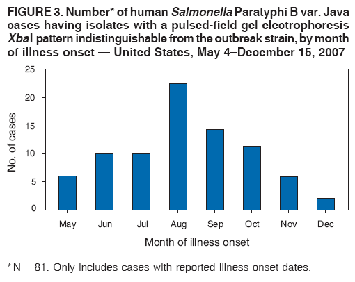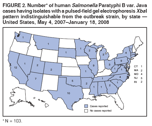 Persons using assistive technology might not be able to fully access information in this file. For assistance, please send e-mail to: mmwrq@cdc.gov. Type 508 Accommodation and the title of the report in the subject line of e-mail. Multistate Outbreak of Human Salmonella Infections Associated with Exposure to Turtles --- United States, 2007--2008Turtles and other reptiles have long been recognized as a source of human Salmonella infections (1). To prevent turtle-associated Salmonella infections in humans, the sale and distribution of small turtles (i.e., those with a carapace length of less than 4 inches) (Figure 1) has been prohibited in the United States since 1975.* Despite this prohibition, small turtles remain available to the public from various sources, including pet shops, flea markets, street vendors, and Internet websites (2,3). In October 2007, the North Carolina Division of Public Health (NCDPH) notified CDC of human infections caused by Salmonella serotype Paratyphi B L (+) tartrate (+) (Salmonella Paratyphi B var. Java) in several states. Salmonella Paratyphi B var. Java is a nontyphoidal strain of Salmonella that causes gastroenteritis. This report describes the results of the epidemiologic and laboratory investigation conducted by CDC and state and local health departments during October 2007--January 2008. The findings document an ongoing, multistate outbreak of Salmonella Paratyphi B var. Java infections, with the first reported illness onset occurring on May 4, 2007. Many of these infections have occurred in young children and have been associated with exposure to small turtles. Prohibiting the sale and distribution of small turtles likely remains the most effective public health action to prevent turtle-associated salmonellosis. Detection of the OutbreakOn August 31, 2007, a girl aged 13 years visited a South Carolina hospital emergency department, where she reported a 5-day history of bloody diarrhea, abdominal cramps, fever, and vomiting. She was treated with trimethoprim-sulfamethoxazole and intravenous fluids but was not hospitalized. Her illness resolved in 7 days. A stool specimen yielded Salmonella Paratyphi B var. Java. Also on August 31, a girl aged 15 years was admitted to a North Carolina hospital with acute renal failure and a 4-day history of bloody diarrhea, abdominal cramps, fever, and vomiting. She was hospitalized for 8 days and recovered fully. A joint investigation by NCDPH and the South Carolina Department of Health and Environmental Control revealed that, on August 24, the two girls had swum in an unchlorinated, in-ground swimming pool belonging to the family of the older girl. Two pet turtles belonging to the family also were permitted to swim in the pool. The turtles, both of which had carapace lengths of less than 4 inches, had been purchased recently from a pet shop in South Carolina. A water sample collected from the turtle habitat yielded Salmonella Paratyphi B var. Java with an XbaI pattern indistinguishable by pulsed-field gel electrophoresis (PFGE) from the isolates of the younger girl. Stool specimens were not collected from the older girl. On October 5, NCDPH informed PulseNet that tests of isolates from three other persons revealed Salmonella Paratyphi B var. Java with an XbaI pattern indistinguishable from the isolates of the younger girl and the turtle habitat (defined as the outbreak strain). On October 5, in response to a request issued by NCDPH through PulseNet, several other state health departments reported human Salmonella Paratyphi B var. Java isolates with an XbaI pattern indistinguishable from the outbreak strain. The Ohio Department of Health provided further evidence of a turtle-associated outbreak by reporting that isolates indistinguishable from the outbreak strain had been obtained from a patient with exposure to a small turtle during the week before illness onset, from that patient's pet turtle, and from water collected from the turtle's habitat. Multistate InvestigationAfter NCDPH contacted CDC on October 23 about the possible cluster of turtle-associated Salmonella Paratyphi B var. Java infections, CDC and state and local health departments initiated a multistate investigation to determine the extent of the outbreak and the sources of infection. A case was defined as a diarrheal illness with onset after May 1, 2007, in a person from whom a clinical specimen yielded Salmonella Paratyphi B var. Java with a PFGE XbaI pattern indistinguishable from the outbreak strain; cases were identified by a review of all PFGE-typed isolates in the PulseNet database. As of January 18, 2008, a total of 103 cases with isolates indistinguishable from the outbreak strain had been reported to CDC from 33 states (Figure 2). Information initially was collected from general enteric disease questionnaires administered by state and local health departments. Of the 100 patients for whom age information was available (median age: 7.5 years; range: <1--87 years), 56 (56%) were aged <10 years. Fifty-two (51%) of the 101 patients for whom the sex was known were female. Illness onset dates ranged from May 4, 2007, to December 15, 2007 (Figure 3). Among the 78 patients for whom clinical information was available, 51 (65%) reported bloody diarrhea, with a median duration of illness of 7 days; 24 (30%) of the 80 patients for whom hospitalization status was known were hospitalized for their illnesses, with a median duration of 4 days. Among the 80 patients questioned about turtle exposure, 47 (59%) reported turtle exposure during the 7 days before illness onset. No deaths were reported. A case-control study was conducted during November 15--December 5 using age- and neighborhood-matched controls (age groups: <1 year, 1--9 years, 10--19 years, 20--49 years, >50 years; reverse-digit dialing was used to match cases to controls by neighborhood). A telephone questionnaire was used to determine whether the case-patient or control had exposure to turtles, other