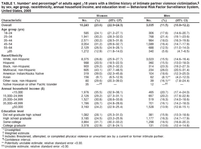 Persons using assistive technology might not be able to fully access information in this file. For assistance, please send e-mail to: mmwrq@cdc.gov. Type 508 Accommodation and the title of the report in the subject line of e-mail. Adverse Health Conditions and Health Risk Behaviors Associated with Intimate Partner Violence --- United States, 2005An erratum has been published for this article. To view the erratum, please click here. Intimate partner violence (IPV) is defined as threatened, attempted, or completed physical or sexual violence or emotional abuse by a current or former intimate partner. IPV can be committed by a spouse, an ex-spouse, a current or former boyfriend or girlfriend, or a dating partner (1). Each year, IPV results in an estimated 1,200 deaths and 2 million injuries among women and nearly 600,000 injuries among men (1). In addition to the risk for death and injury, IPV has been associated with certain adverse health conditions and health risk behaviors (1). To gather additional information regarding the prevalence of IPV and to assess the association between IPV and selected adverse health conditions and health risk behaviors, CDC included IPV-related questions in an optional module of the 2005 Behavioral Risk Factor Surveillance System (BRFSS) survey. This report describes the results of that survey, which indicated that persons who report having experienced IPV during their lifetimes also are more likely to report current adverse health conditions and health risk behaviors. Although a causal link between IPV and adverse health conditions cannot be inferred from these results, they underscore the need for IPV assessment in health-care settings. In addition, the results indicate a need for secondary intervention strategies to address the health-related needs of IPV victims and reduce their risk for subsequent adverse health conditions and health risk behaviors. BRFSS is an annual, state-based, random-digit--dialed telephone survey of the noninstitutionalized, U.S. civilian population aged >18 years. The survey solicits information on a range of health conditions and health risk behaviors. Data are weighted to account for probability of selection and to match the age-, race/ethnicity-, and sex-specific populations from annually adjusted intercensal estimates. In 2005, a total of 70,156 respondents (42,566 women and 27,590 men) in 16 states and two territories* completed the optional IPV module. Among these 18 states/territories, the median response rate for the 2005 BRFSS core survey, based on Council of American Survey and Research Organizations (CASRO) guidelines, was 51.6% (range: 37.8% [Massachusetts] to 72.7% [Puerto Rico]). The design and characteristics of BRFSS have been described previously. Logistic regression models were stratified by sex and included age, race/ethnicity, annual household income, and education level as control variables. Statistical significance (p<0.05) was determined using the Wald chi-square test. The IPV module included four questions regarding physical or sexual violence by a current or former intimate partner that respondents had experienced during their lifetimes. Respondents were classified as having experienced IPV if they reported that any of the following had occurred during their lifetimes: threatened, attempted, or completed physical violence or unwanted sex by a current or former intimate partner.§ Health conditions and risk behaviors were selected to cover the full range of conditions and behaviors assessed by BRFSS. These included two self-reported health conditions: 1) current use of disability equipment (e.g., a cane, wheelchair, or special bed) and 2) current activity limitations because of physical, mental, or emotional problems. Respondents also were asked whether they had ever been told by a doctor, nurse, or other health-care professional that they had 1) high blood cholesterol; 2) nongestational high blood pressure; 3) nongestational diabetes; 4) cardiovascular disease (e.g., heart attack, angina, coronary heart disease, or stroke); 5) joint disease (e.g., arthritis, rheumatoid arthritis, gout, lupus, or fibromyalgia); or 6) current asthma. In addition, selected health risk behaviors were assessed: 1) risk factors for human immunodeficiency virus (HIV) infection or sexually transmitted diseases (STDs) (i.e., if, during the preceding year, respondent had used intravenous drugs, had been treated for an STD, had given or received money or drugs in exchange for sex, or had participated in anal sex without a condom); 2) current smoking; 3) heavy or binge alcohol use (i.e., more than two drinks per day on average for men, more than one drink per day on average for women, or five or more drinks on one occasion during the preceding 30 days for men and women); and 3) having a body mass index (BMI) (weight [kg]/ height [m2]) >25.¶ Lifetime IPV prevalence estimates were calculated by sex, age group, race/ethnicity, annual household income, and education level (Table 1). Lifetime IPV prevalence was significantly higher (p<0.05) among women than among men; higher among multiracial, non-Hispanic, and American Indian/Alaska Native women; and higher among lower-income respondents. The prevalence of each health condition and risk behavior was calculated by sex of the respondent and lifetime experience of IPV (Table 2). In addition, associations between lifetime IPV and health conditions and risk behaviors were assessed in individual logistic regression models, controlling for age, race/ethnicity, annual household income, and education level (Table 3). With the exceptions of diabetes, high blood pressure, and BMI >25, reporting of health conditions and risk behaviors was significantly higher among women who had experienced IPV during their lifetimes compared with women who had never experienced IPV. Among women, adjusted odds ratios ranged from 1.3 (95% confidence interval [CI] = 1.1--1.4) for high blood cholesterol to 3.1 (CI = 2.