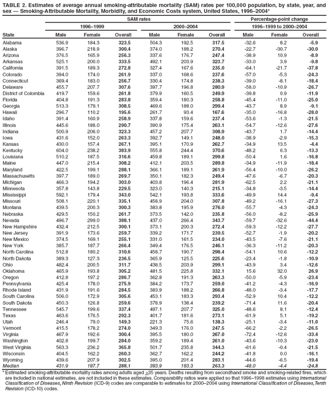 Persons using assistive technology might not be able to fully access information in this file. For assistance, please send e-mail to: mmwrq@cdc.gov. Type 508 Accommodation and the title of the report in the subject line of e-mail. State-Specific Smoking-Attributable Mortality and Years of Potential Life Lost --- United States, 2000--2004Please note: An erratum has been published for this article. To view the erratum, please click here. Smoking can cause lung and other cancers, coronary heart disease, stroke, chronic respiratory disease, and other diseases (1). In 2008, CDC reported that cigarette smoking and exposure to secondhand smoke resulted in an estimated 443,000 deaths and 5.1 million years of potential life lost (YPLL) annually in the United States during 2000--2004 (2). This report presents state-specific average annual smoking-attributable mortality (SAM) and YPLL estimates for the same period among adults aged >35 years. The report also compares 2000--2004 average annual SAM rates per 100,000 population with rates for 1996--1999. The analysis was based on data from CDC's Smoking-Attributable Mortality, Morbidity, and Economic Costs (SAMMEC) system.* Substantial variation in average annual number of deaths attributed to smoking during 2000--2004 occurred among the states (range: 492 [Alaska] to 36,687 [California]). From 1996--1999 to 2000--2004, declines in SAM rates occurred in 49 states and the District of Columbia (DC), reflecting progress made in lowering smoking prevalence in the United States during the past 40 years. Rates declined in men in 49 states and DC, but declined in women in only 32 states. To reduce SAM rates further, comprehensive evidence-based approaches for preventing smoking initiation and increasing cessation need to be implemented fully, and states should fund tobacco control activities at the level recommended by CDC (3,4). State-specific SAM and YPLL from smoking were estimated by using SAMMEC. Sex- and age-specific SAMs were calculated by multiplying the total number of deaths among adults aged >35 years from 19 diseases caused by cigarette smoking (1) by estimates of the smoking-attributable fraction (SAF) of preventable deaths for each disease. The attributable fractions provide estimates of the public health burden of each risk factor and the relative importance of risk factors for multifactorial diseases (2). SAFs were derived using sex-specific relative risk (RR) estimates for current and former smokers for each cause of death from the American Cancer Society's Cancer Prevention Study-II (CPS-II) for the period 1982--1988. For ischemic heart disease and cerebrovascular disease mortality, RR estimates were stratified by age (35--64 years and >65 years). Sex- and age-specific (35--64 years and >65 years) current and former cigarette smoking prevalence estimates from the Behavioral Risk Factor Surveillance System (BRFSS) were used to calculate the SAFs. Smoking-attributable YPLL were estimated by multiplying sex- and age-specific SAM by remaining life expectancy at the time of death. State-specific SAM rates per 100,000 population by sex for a given year were calculated using state SAM estimates for the year and population estimates from the U.S. Census Bureau. International Classification of Diseases, Ninth Revision (ICD-9) codes were used for cause of death in 1996--1998, whereas International Classification of Diseases, Tenth Revision (ICD-10) codes were used for 1999--2004 data. Comparability ratios (5) from ICD-9 to ICD-10 were applied to 1996--1998 data to enable comparisons with 2000--2004 data. Data for the years 2000--2004 were used in this report because they correspond to the years available to states in the SAMMEC system to calculate their state-specific SAM estimates. Infant deaths caused by smoking during pregnancy, deaths from exposure to secondhand smoke, and smoking-related fire deaths (2) were not included in the state-specific estimates. During 2000--2004, the state-specific median estimate of the average annual number of smoking-attributable deaths among adults aged >35 years was 5,534 (range: 492 [Alaska] to 36,687 [California]). SAM estimates for males ranged from 314 (Alaska) to 21,407 (California) and the SAM estimates for females ranged from 178 (Alaska) to 15,280 (California). For every state, the annual number of smoking-related deaths was higher among males than females (Table 1). The average annual YPLL estimates ranged from 7,762 (Alaska) to 481,529 (California). The YPLL estimates ranged from 4,586 (Alaska) to 288,823 (California) for males and from 3,176 (Alaska) to 192,706 (California) for females (Table 1). During 2000--2004, overall average annual SAM rates per 100,000 population were lowest in Utah (138.3), Hawaii (167.6), and Minnesota (215.1), and highest in Kentucky (370.6), West Virginia (344.3), and Nevada (343.7) (Table 2). Median SAM rates per 100,000 population overall were 288.1 for 1996--1999 and 263.3 for 2000--2004 (Table 2). Changes in smoking-attributable deaths per 100,000 population during these two periods varied among states; SAM rates among adults declined the most in Nevada (-44.4 deaths per 100,000 population), California (-37.8), and Virginia (-33.4). Average annual overall SAM rates decreased from 1996--1999 to 2000--2004 in all states except Oklahoma, which experienced an increase of 26.9 deaths per 100,000. Compared with 1996--1999, average annual SAM rates declined in 2000--2004 among men in all states except Oklahoma, but increased among women in several states (Alabama, Arizona, Arkansas, Georgia, Indiana, Kansas, Kentucky, Louisiana, Mississippi, Michigan, North Carolina, Ohio, Oklahoma, South Carolina, South Dakota, Tennessee, Texas) and DC (Table 2). Reported by: B Adhikari, PhD, J Kahende, PhD, A Malarcher, PhD, C Husten, MD, K Asman, MSPH, National Center for Chronic Disease Prevention and Health Promotion, CDC. Editorial Note:During 2000--2004, substantial variation occurred in t