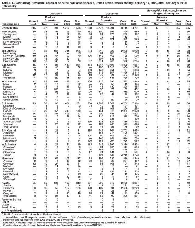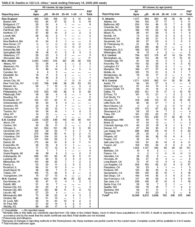 Persons using assistive technology might not be able to fully access information in this file. For assistance, please send e-mail to: mmwrq@cdc.gov. Type 508 Accommodation and the title of the report in the subject line of e-mail. Notifiable Diseases/Deaths in Selected Cities Weekly InformationFigure I Selected notifiable disease reports, United States, comparison of provisional 4-week totals ending February 14, 2009, with historical data Table I Summary of provisional cases of selected notifiable diseases, United States, cumulative, week ending February 14, 2009 (6th Week) Table II Provisional cases of selected notifiable diseases, United States, weeks ending February 14, 2009 and February 19, 2008 (6th Week) Table III Deaths in 122 U.S. cities, week ending February 14, 2009 (6th Week) Figure I ![]() Return to top. Table I ![]() ![]() Return to top. Table II