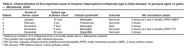 Persons using assistive technology might not be able to fully access information in this file. For assistance, please send e-mail to: mmwrq@cdc.gov. Type 508 Accommodation and the title of the report in the subject line of e-mail. Invasive Haemophilus influenzae Type B Disease in Five Young Children --- Minnesota, 2008In 2008, five children aged <5 years were reported to the Minnesota Department of Health (MDH) with invasive Haemophilus influenzae type b (Hib) disease; one died. Only one of the children had completed the primary Hib immunization series; three had received no doses of Hib-containing vaccine (1). The five Hib cases are the largest number among children aged <5 years reported from Minnesota since 1992. The cases occurred during a Hib vaccine recall and continuing nationwide shortage that began in December 2007. The recall of certain lots of the two Hib-containing vaccines manufactured by Merck & Co., Inc. (West Point, Pennsylvania) and cessation of production of both vaccines left only one manufacturer of Hib vaccine in the United States (Sanofi Pasteur, Swiftwater, Pennsylvania) (2,3). In response, CDC recommended that health-care providers defer the routine 12--15 month booster dose for children not at increased risk for Hib disease (2,3). CDC also emphasized that all children should complete the primary series with available Hib-containing vaccines. However, Minnesota vaccination data indicate that primary Hib series coverage was lower during 2008 than coverage with other vaccines administered at the same ages and lower than Hib coverage in previous years. Increases in Hib cases like the one in Minnesota do not appear to have occurred in other states. The increase highlights the need to ensure that all children complete the primary Hib immunization series. Additional investigation to better elucidate the factors that led to these cases is being conducted by MDH and CDC. Minnesota conducts surveillance for invasive H. influenzae disease as part of the Active Bacterial Core surveillance system of CDC's Emerging Infections Program (4). A Hib case is defined as isolation of H. influenzae from a normally sterile site in a resident of the state. Merck products are both Hib PRP-OMP* vaccines, for which a primary series consists of 2 doses at 2 and 4 months. Sanofi Pasteur products are Hib PRP-TT vaccines, for which a primary series consists of a 3-dose primary series at 2, 4, and 6 months. For both Hib vaccine series, a routine booster is recommended at age 12--15 months During 2008 in Minnesota, five children aged 5 months to 3 years were reported with invasive Hib disease; one died (Table). The patients resided in five different counties in Minnesota and had no known relationship to each other. Three patients had received no vaccinations because of parent or guardian deferral or refusal. One child was aged 5 months and had received 2 doses of Hib PRP-TT vaccine in accordance with the primary series schedule. Another child had received 2 doses of Hib PRP-OMP vaccine, but no booster dose, per CDC recommendations during the shortage. Subsequent to Hib infection, this child was diagnosed with hypogammaglobulinemia. None of the five were enrolled in group child care. The five cases in 2008 were the most reported for 1 year from Minnesota since 1992, when 10 cases were reported (Figure 1). Although the recall and cessation of production of Merck Hib-containing vaccines in December 2007 resulted in a nationwide Hib vaccine shortage, supply of the remaining two products manufactured by Sanofi Pasteur is adequate for all infants to complete the 3-dose primary vaccine series. However, in February 2008 the Minnesota Vaccines for Children program began receiving reports from vaccine providers regarding shortages of vaccine in their offices. In response, MDH advised providers to ensure completion of the primary series as recommended whenever possible and to track and recall infants who had not completed the primary series so that they could be vaccinated as soon as doses were available. On January 13, MDH examined 2008 vaccination coverage data in the Minnesota Immunization Information Connection (MIIC), Minnesota's immunization registry. Data were reviewed for 25,699 children born between November 1, 2007 and March 31, 2008 (Figure 2). Among children aged 7 months, 3-dose primary Hib series coverage was 46.5%, which is lower than the age-appropriate coverage for children who had received pneumococcal conjugate or diphtheria and tetanus toxoids and acellular pertussis (DTaP) vaccination. In contrast, data from the 2007 National Immunization Survey, conducted prior to the shortage, showed that Hib vaccination coverage among children in Minnesota aged 19 months to 35 months was high and did not differ from the national average, suggesting that coverage has declined as a result of the shortage. Reported by: J Rainbow, MPH, R Danila, PhD, L Bahta, K White, MPH, K Ehresmann, MPH, R Lynfield, MD, Minnesota Dept of Health. F Coronado, MD, A Cohn, MD, T Clark, MD, N Messonnier, MD, Div of Bacterial Diseases, J Santoli, MD, L Rodewald, MD, Immunization Svcs Div, National Center for Immunization and Respiratory Diseases; M Jackson, PhD, S Lowther, PhD, EIS officers, CDC. Editorial Note:Before development of Hib conjugate vaccines, Hib was the most common cause of bacterial meningitis in children aged <5 years. Since implementation of the Hib conjugate vaccine immunization program in the United States in the early 1990s, the incidence of Hib disease has declined from a peak of 41 cases per 100,000 children aged <5 years in 1987 to approximately 0.11 cases per 100,000 in 2007 (3,5). As with other bacterial diseases in which acquisition of carriage is necessary for development of invasive disease, reductions in asymptomatic carriage and transmission are substantial contributors to the reduction in Hib disease achieved through vaccination programs (6--8). This herd immunity provided by high vaccination