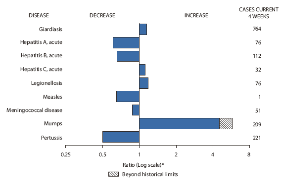 Alternate Text: The figure above shows selected notifiable disease reports for the United States, with comparison of provisional 4-week totals through March 27, 2010, with historical data. Reports of giardiasis, acute hepatitis C, legionellosis, and mumps all increased, with mumps increasing beyond historical limits. Reports of acute hepatitis A, acute hepatitis B, measles, meningococcal disease, and pertussis all decreased.