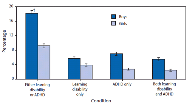 Among youths aged 5--17 years, during 2006--2009, boys were twice as likely as girls (18.2% versus 9.2%) to have been diagnosed with either a learning disability or attention deficit hyperactivity disorder (ADHD). Approximately 5.7% of boys had a learning disability without ADHD, compared with 3.9% of girls, 7.0% of boys had ADHD without a learning disability compared with 2.8% of girls, and 5.5% of boys had both a learning disability and ADHD compared with 2.5% of girls.