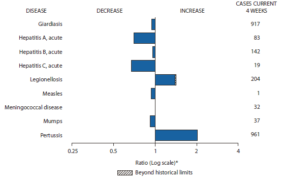 Alternate Text: The figure above shows selected notifiable disease reports for the United States, with comparison of provisional 4-week totals through October 30, 2010, with historical data. Reports of legionellosis, meningococcal disease, and pertussis increased, with reports of legionellosis increasing beyond historical limits. Reports of giardiasis, acute hepatitis A, acute hepatitis B, acute hepatitis C, measles, and mumps all decreased.