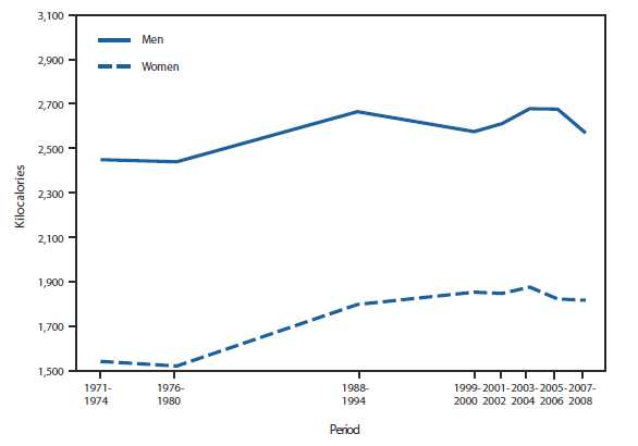Alternate Text: The figure above shows age-adjusted daily kilocalorie intake among adults aged 20-74 years, by sex, in the United States, during 1971-2008. The average daily kilocalorie intake for men increased from the period 1971-1974 to 1988-1994 and then leveled off through 2007-2008. For women, the average daily kilocalorie intake increased from the period 1971-1974 to 1999-2000 and remained relatively stable through 2007-2008. Throughout the period 1971-1974 through 2007-2008, men consumed more kilocalorie on a daily basis than women.
