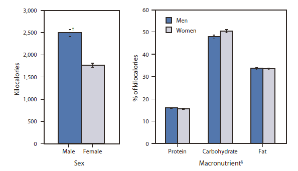 Alternate Text: The figure above shows age-adjusted kilocalorie and macronutrient intake among adults aged ≥20 years, by sex, in the United States during 2007-2008, based on results of the National Health and Nutrition Examination Survey. During 2007-2008, the average daily intake of kilocalories was 2,504 kilocalories for men and 1,771 kilocalories for women. Women consumed more energy from carbohydrates than men (50.5% of total daily intake of kilocalories, compared with 47.9% for men). A slight difference was observed in the percentage of kilocalories from protein (15.5% for women and 15.9% for men), and virtually no difference was observed in the percentage of kilocalories from fat (33.6% for men and 33.5% for women).