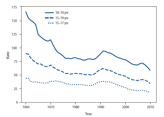 Alternate Text: The figure above shows birth rates for teens aged 15-19 years, by age group, in the United States during 1960-2010. U.S. teen birth rates declined to historic lows for all age groups in 2010. The rate for teens aged 15-19 years fell 62% from 1960, when the birth rate was 89.1 per 1,000 women and 44% from a rate of 61.8 in 1991 to 34.3 in 2010. Most of the decline in birth rates for teens occurred from 1960 to 1980 and then again after 1991. Decreases in birth rates for teens aged 18-19 years generally were greater than the decreases for teens aged 15-17 years from 1960 to 1978. From 1991 to 2010, decreases in birth rates for teens aged 15-17 years were greater.